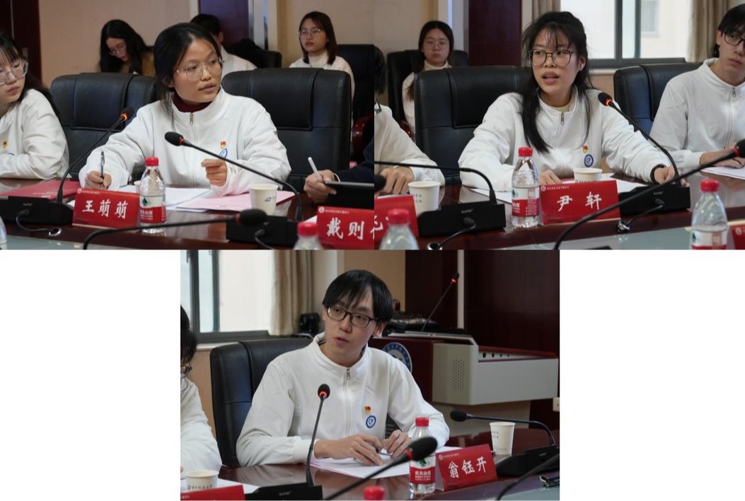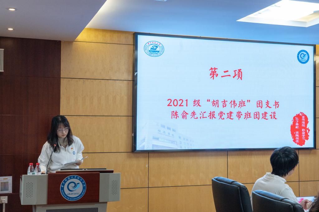 2021级“胡吉伟班”团支部书记陈俞先汇报了党建带班团建设情况,她介绍了支部在党建领航、学风启航、队伍护航、实践助航、榜样引航五个方面的经验做法。支部坚持强化思想引领、勤学筑牢根基、传承经世使命、躬耕社会实践、发挥朋辈力量。