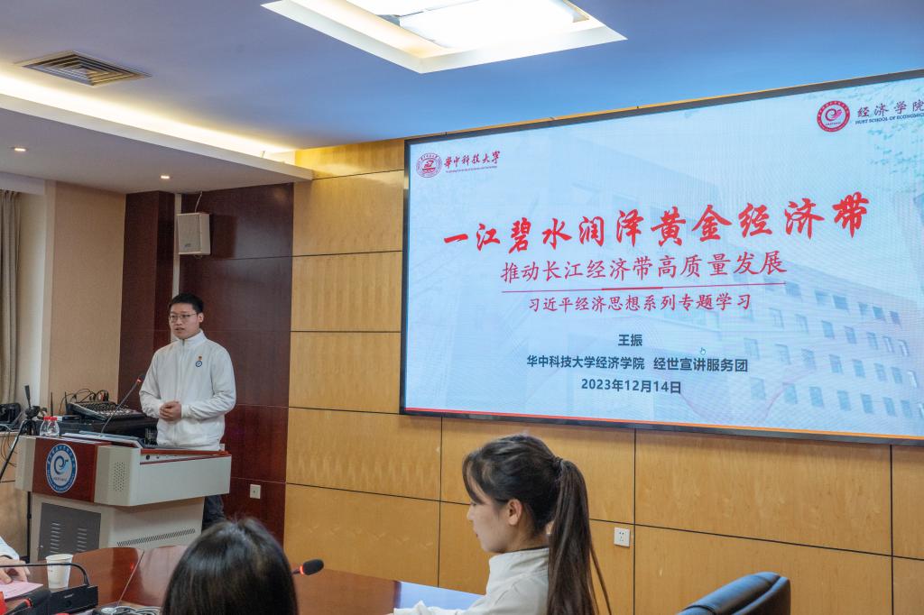 公司经世宣讲服务团讲师代表、硕士2101班王振以“推动长江经济带高质量发展”为主题进行微党课分享。他解读了习近平总书记对推动长江经济带高质量发展的重要论述,并号召经院学子强化责任担当,坚定专业自信、深入专业研究,贡献专业智慧。