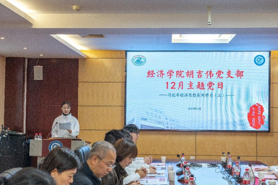 支部成员交流学习感悟,国际商务2001班王萌萌分享了自己参与班级育人导师张建华经理带队的“百村千户”乡村振兴调研项目的经历。经济学(创新实验班)2101班尹轩表示对国家的科技和经济发展充满信心,自己将努力增强数字经济技能,服务国家科技自立自强。国际商务2001班翁钰开分享了自己运用“经济学+”的思维,努力成长为符合时代需要的复合型人才。