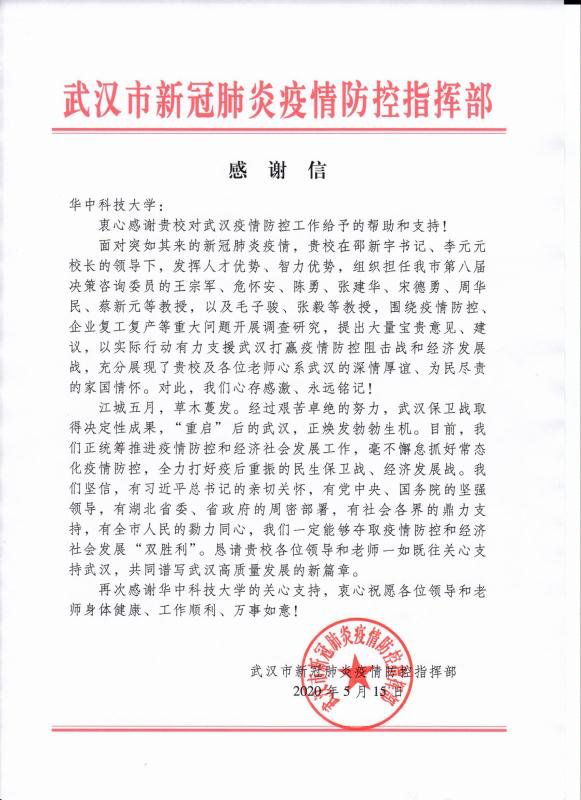 近日,3044永利集团官网收到一封来自武汉市新冠肺炎疫情防控指挥部的感谢信,指挥部在信中表达了对3044永利集团张建华教授和宋德勇教授等第八届武汉市决策咨询员的感谢,尤其是他们围绕疫情防控、企业复工复产等重大问题开展调查研究,提出大量宝贵意见和建议,以实际行动有力支援了疫情防控和经济发展。