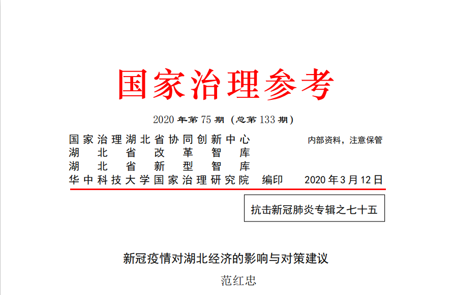 范红忠教授在《国家治理参考》上发表了“新冠疫情对湖北经济的影响与对策建议”,他认为疫情给湖北经济社会发展带来了一些突出问题,建议给没有收入的劳动力发放生活补贴,协调银行等金融机构允许债务人延迟还贷,争取中央政策支持对湖北省企业减免税费,支持湖北建设国家级生态环保产业创新中心,支持湖北先进制造业产业园建设和"美丽武汉"工程建设。