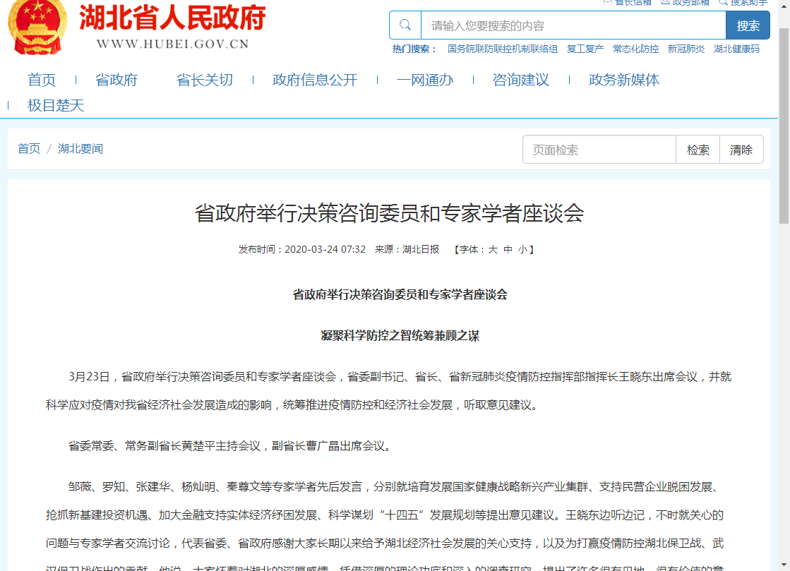张建华教授在湖北省政府举办的决策咨询委员会、学者专家座谈会上详细分析了目前中国和湖北省宏观经济走势,对中国宏观经济走势的基本判断,提出“避免疫情带来的短期冲击长期化是当前宏观政策的关注重点”,建议在把疫情短期冲击降到最低的同时而又不忽略长期结构转型、增长动力转换,在防范全球经济危机抬头与金融系统性风险的同时稳增长与就业。张建华教授还在给湖北省人民政府咨询委员会、武汉市人民政府研究室的建议报告中分别提出提前研究疫后复工复产定向专项支持政策,提前谋划解除交通管控预案等建议,为中央政府和省市政府实施扶持专项,加快经济复苏提供具体的策略。