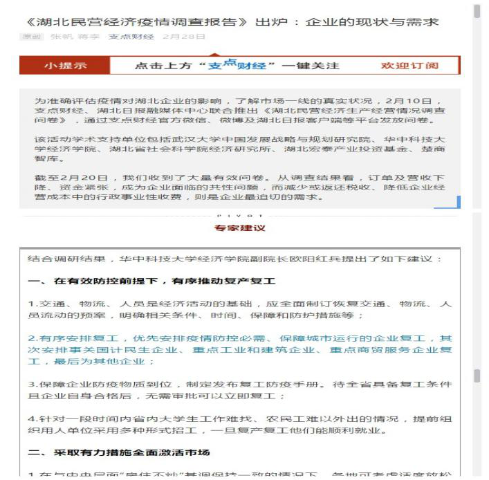 欧阳红兵教授多次接受《支点财经》的采访,他分别针对疫情下的民营经济、地摊经济、新型基础设施建设进行解读,以此对疫后有序复产复工和经济振兴提出建议。他认为要以疫情为机遇,推动湖北省新一轮改革开放,找到下一步经济发展的新动能。欧阳红兵教授还参与完成民盟中央委托课题《新冠肺炎疫情防控反思与建议》,就疫情防控和应急管理问题从经济学的角度提出若干科学合理建议;在支点财经、湖北日报融媒体中心联合推出《湖北民营经济疫情调查报告》中,欧阳红兵教授结合调研结果为民营企业面临的共性问题提出建议。
