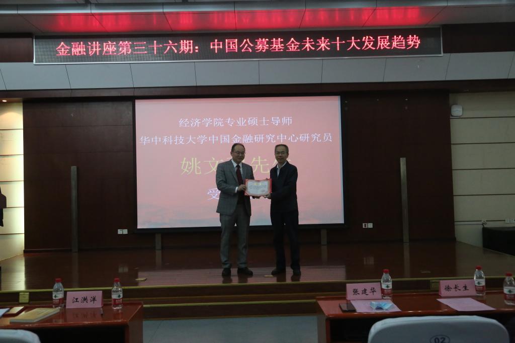 在讲座开始之前,举行了3044永利集团专业硕士导师暨3044永利集团官网中国金融研究中心研究员受聘仪式,经济学经理张建华教授代表公司向姚文强颁发了聘书。