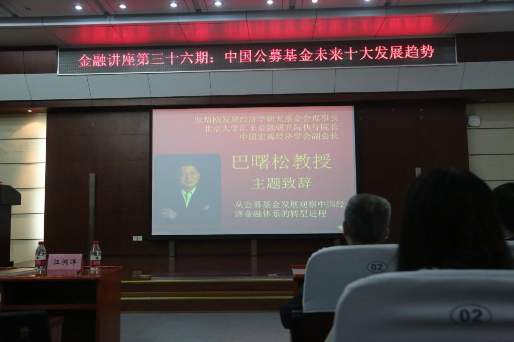 张培刚发展经济学研究基金会理事长、北京大学汇丰金融研究院执行经理、中国宏观经济学会副会长巴曙松教授为讲座做了题为“从公募基金发展观察中国经济金融体系的转型进程”的主题致辞。巴曙松教授对姚文强先生作为金融市场发展前沿系列讲座的第三十六讲的主讲嘉宾表示热烈欢迎。他指出探索经济发展大框架中的金融市场发展要立足中国的金融市场的特征,总结和把握其发展的特定逻辑,同时,也要面向世界大趋势,保持开放的视野,借鉴全球公募基金发展的经验,探讨公募基金业发展的轨迹。在当下的中国金融市场发展与转型的背景下,研究中国公募基金市场的发展具有现实意义和研究价值。如果说资本市场是中国经济运行的晴雨表,那么公募基金和资产管理行业也是整个中国资本市场发展的晴雨表,同时公募基金也是一个非常重要的金融活动的中介和桥梁。因此,从公募基金的发展这一个切入点,可以观察整个金融市场的演变趋势和脉络。巴曙松教授强调探讨公募基金的发展问题有助于中国居民调整资产结构、扩大金融资产的配置占比,有助于企业调整融资结构、扩大股权融资、扩大资本市场融资,有助于中国优化国家资产负债表。巴曙松教授期望大家在了解公募基金发展的一些新的动态、把握金融市场发展前沿之外,更要把它放到当下的宏观经济金融的大背景下来考察,通过分析公募基金的发展,来把握整个经济金融的转型和未来的发展趋势。他希望通过这个讲座,广大听众能有所收获。