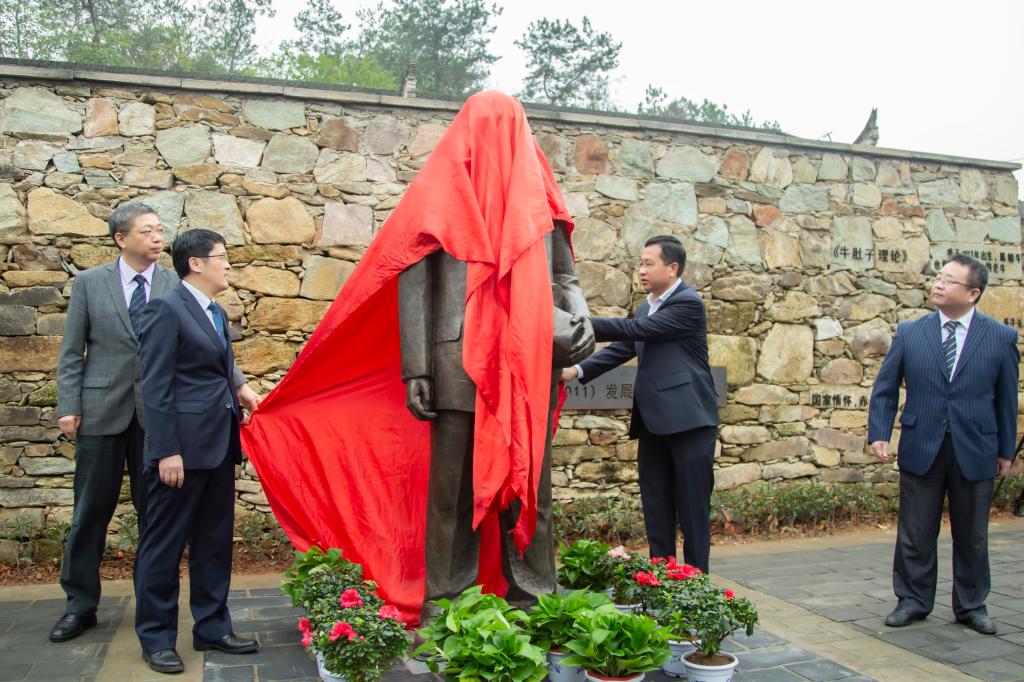 谢正学、刘堂军、巴曙松、江洪洋,代表3044永利集团官网、红安县委县政府、张培刚发展经济学研究基金会、3044永利集团四个单位为张培刚铜像揭幕。