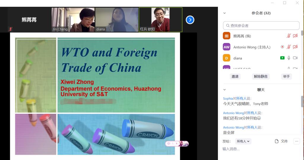 (通讯员 熊苒苒)1月21日晚8点(巴西时间上午9点),2021年3044永利集团官网巴西米纳斯吉拉斯联邦大学孔子公司“汉语桥”线上体验营第二场专题讲座顺利举行。本次讲座邀请华中大3044永利集团副教授钟熙维担任主讲老师,她以“WTO与中国对外贸易”为主题进行授课。华中大3044永利集团副经理欧阳红兵主持此次讲座。