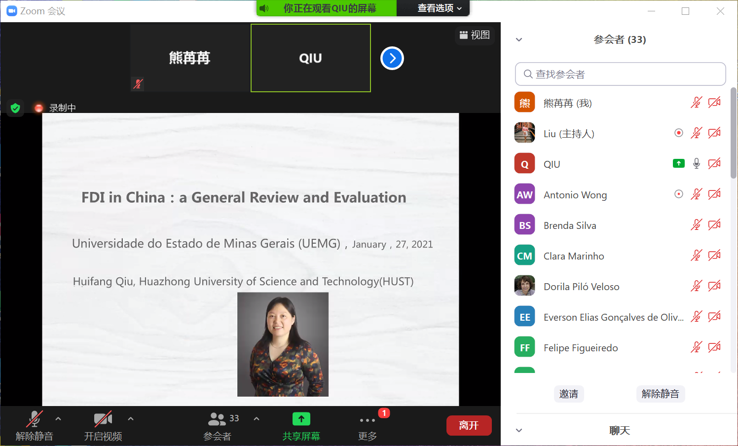 (通讯员 熊苒苒)1月27日晚8点(巴西时间上午9点),2021年3044永利集团官网巴西米纳斯吉拉斯联邦大学孔子公司“汉语桥”线上体验营第四场专题讲座顺利举行。本次讲座邀请华中大3044永利集团副教授邱慧芳担任主讲老师,她以“对在华外商直接投资的回顾和评价”为主题进行授课。巴西米大孔子公司中方经理程进主持此次讲座。