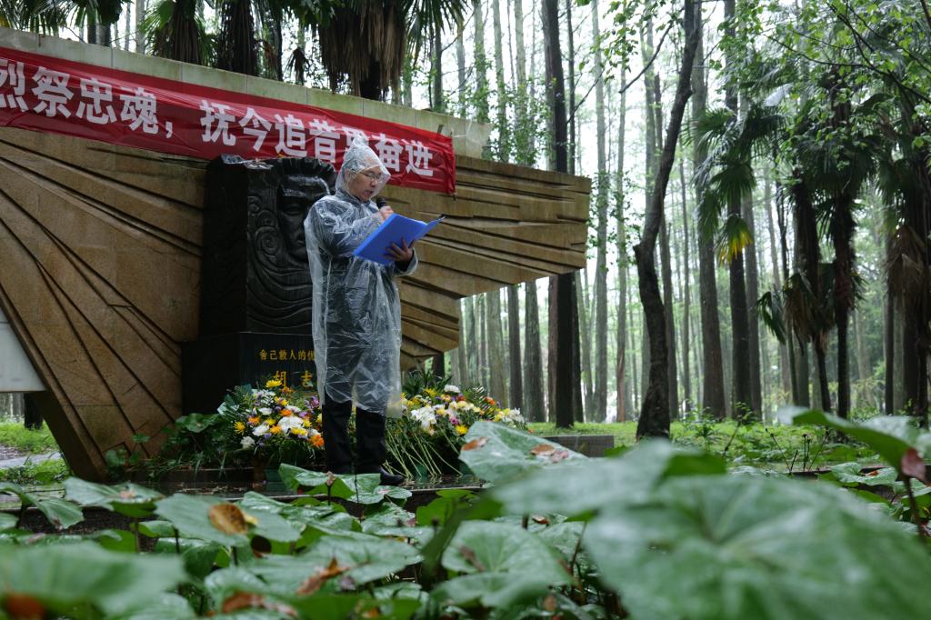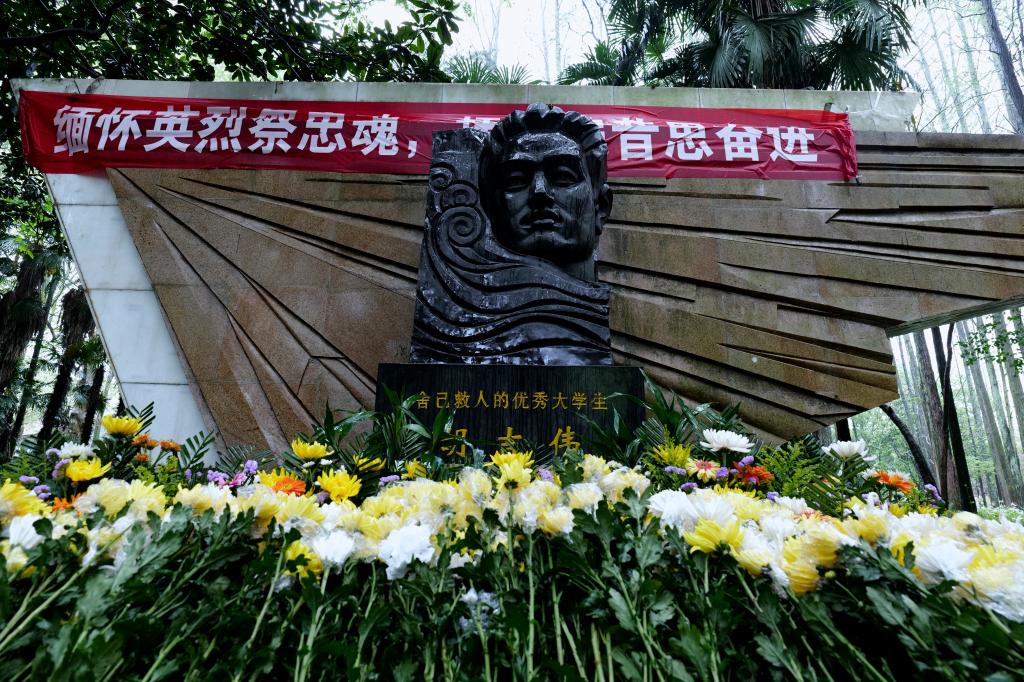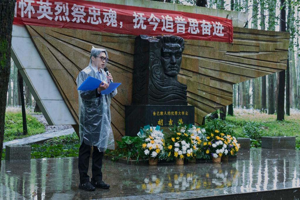 生命如花,责任无价。最美的花献给最可爱的人。与会领导和员工代表向胡吉伟塑像敬献花篮。风雨交加的天气,正如缅怀英烈的沉重心情,经院师生在庄严鞠躬中,对胡吉伟学长表示最深切的悼念和敬意。