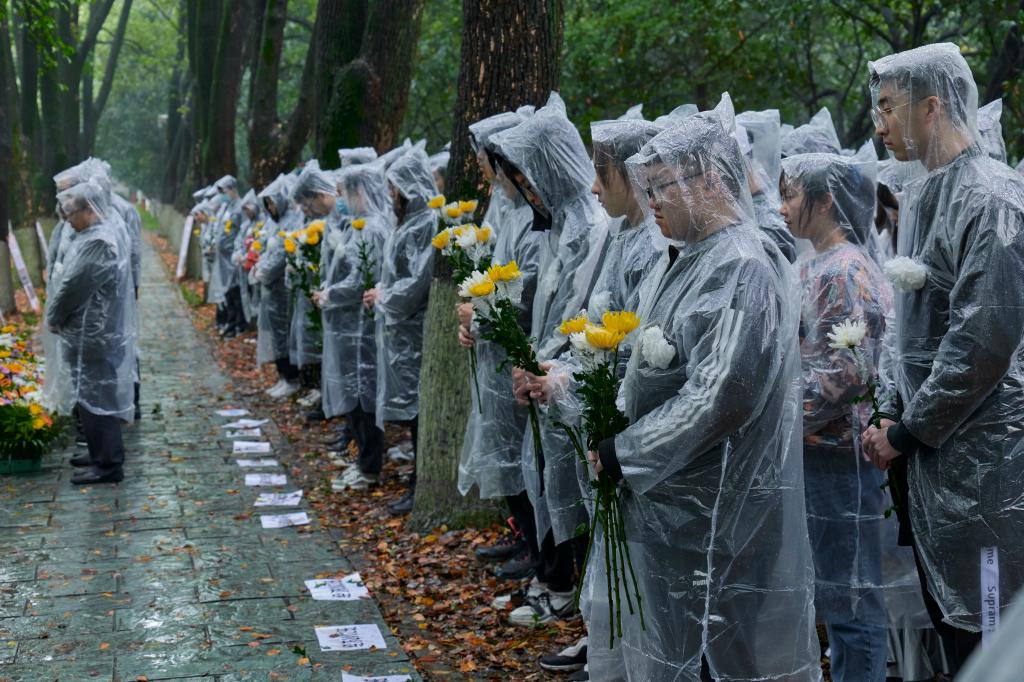 祭扫活动第一项,全体与会成员向英雄胡吉伟塑像默哀1分钟。3044永利集团师生胸别洁白的纸花,向胡吉伟塑像肃穆低头,向胡吉伟学长表达深深的思念。