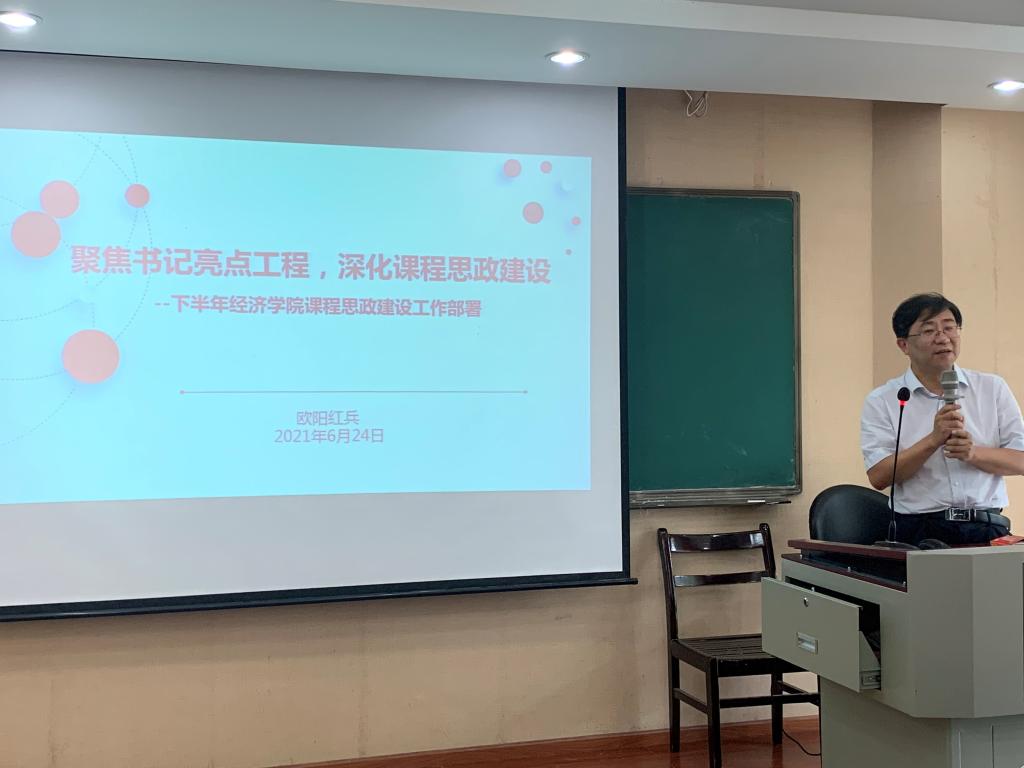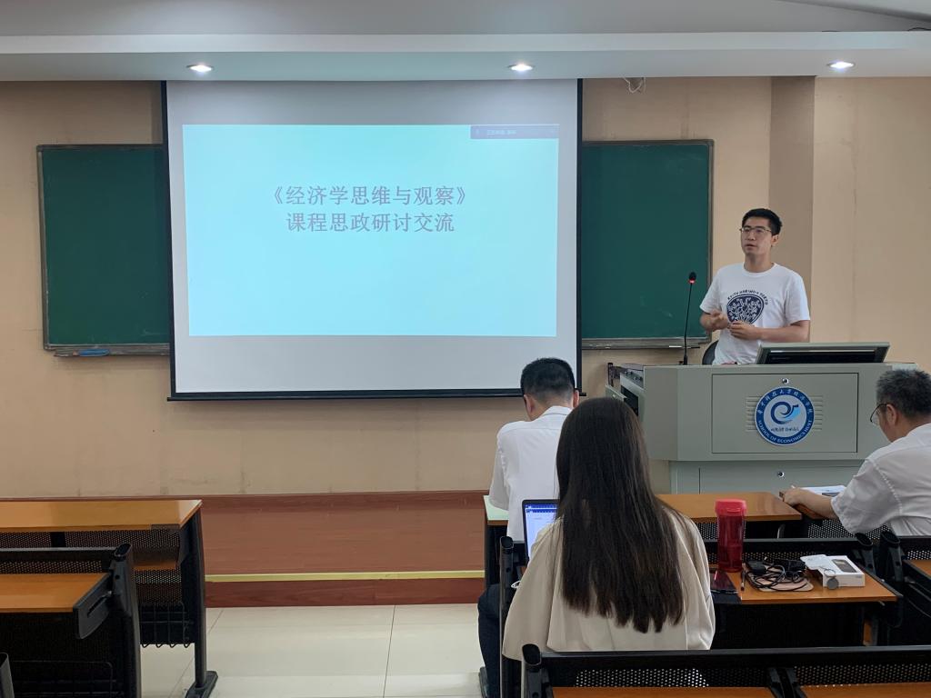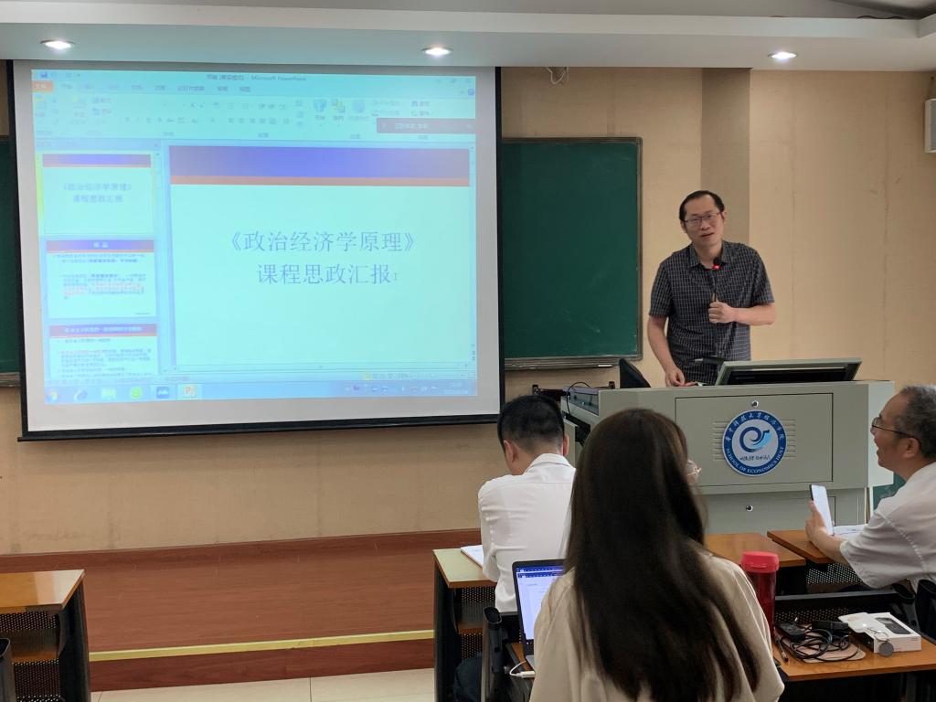 公司教师邢斐、杜立、叶巾祁与在座教师进行课程思政建设分享与深入交流。邢斐从《政治经济学原理》课程中的三个案例(商品、资本主义积累的一般规律和历史趋势、资本的循环)来讲述如何在专业课中将思政内容结合起来,他详细分析教学环节中的思政内容导入,给全院教师提供课程思政实践方式借鉴。