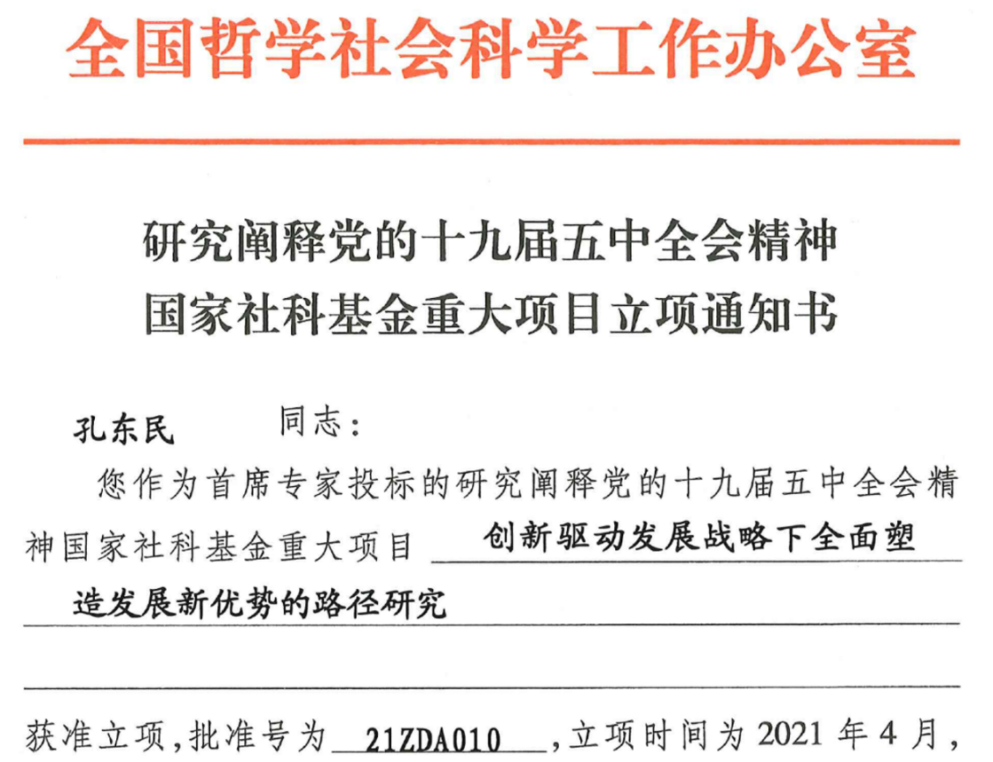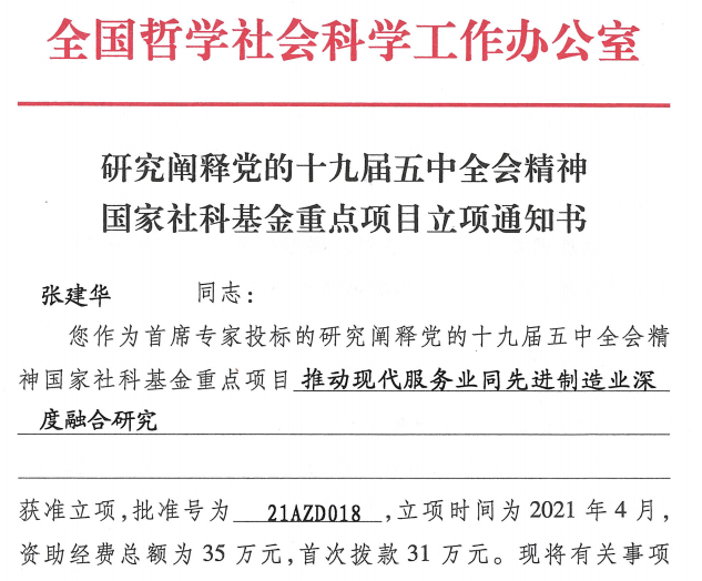 本网讯(通讯员张鹃)近日获悉,全国哲学社会科学工作办公室正式公布了研究阐释党的十九届五中全会精神国家社科基金重大项目立项名单。公司有两个项目或得资助,其中:孔东民教授作为首席专家申报的“创新驱动发展战略下全面塑造发展新优势的路径研究”)获得国家社科基金重大项目资助(项目批准号:21ZDA010,张建华教授作为首席专家申报的“推动现代服务业同先进制造业深度融合研究”获得国家社科基金重点项目资助(项目批准号:21AZD018)。