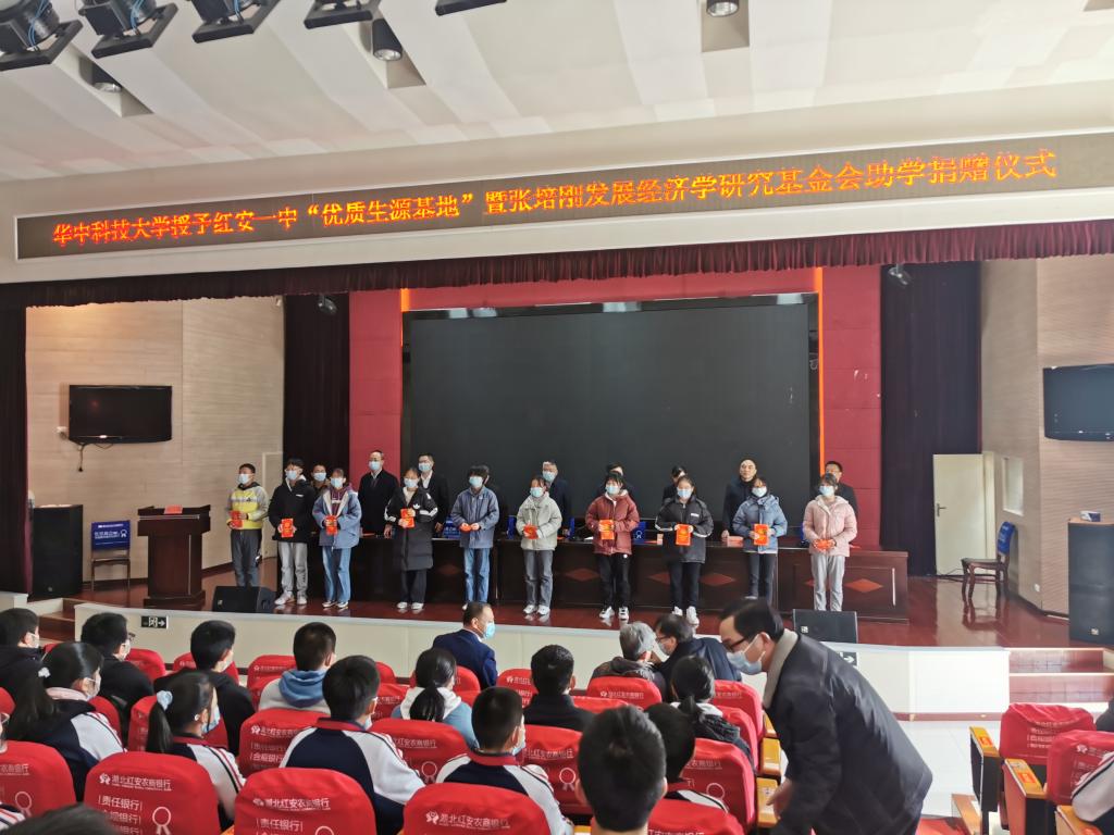 红安一中负责人汪绪林宣读2021年度张培刚助学金获得者名单,与会领导为接受资助的学子颁发助学金。受资助员工代表程秀玲发言。她表示自己会永远铭记周恩来总理在少年时代立下 “为中华之崛起而读书”的宏伟志向,怀揣着“孩儿立志出乡关,学不成名誓不还”的信念,学习张培刚爷爷热爱祖国、严谨创新的品质,在未来学有所成,为祖国建设贡献自己的力量。