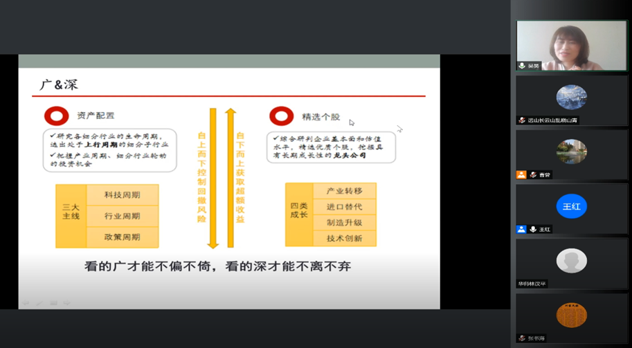 最后,吴昊分享了她个人的投研体会和思考。她指出,要抓住三大主线:科技周期、行业周期、政策周期。研究各细分行业的生命周期,选出处于上升周期的细分子行业,把握产业周期和细分行业轮动的投资机会。四类成长值得投资者关注:产业转移、进口替代、制造升级、技术创新。投资者要综合研判企业基本面和估值水平,精选优质个股,挖掘具有长期成长性的龙头公司。在投资过程中,投资者要把握四类机会:渗透率提升、市占率提升、价值量提升、平台力提升。吴昊围绕三大周期主线,分别以通信技术发展、光伏行业和医疗信息化为例,对具体公司和产业政策进行了深度分析。