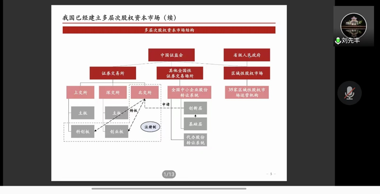 讲座伊始,刘先丰就我国A股市多层次股权资本市场结构进行详细讲解。他指出,三大股权交易市场,分别是证券交易所,其他全国性证券交易场所以及区域性股权市场。作为我国上市企业股权交易最主要的场所,上交所和深交所于1990年12月先后开始营业。两个交易所的成立标志着中国最早的主板诞生。而经过30多年的发展,截至五月末,上交所与深交所主板市场包括3153家上市企业、科创板服务424家“硬科技”企业、创业板1147家企业,与北交所和新三板一起形成了活力的中国股权资本市场。