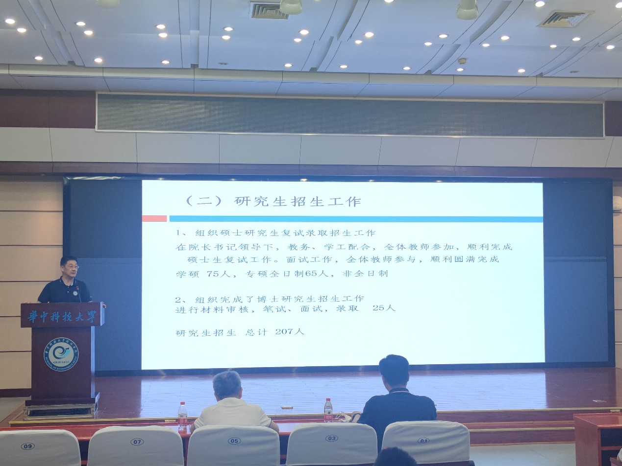党委副书记崔金涛就员工党建工作、学风科研工作、安全稳定、招生宣传和员工工作进行了总结报告。