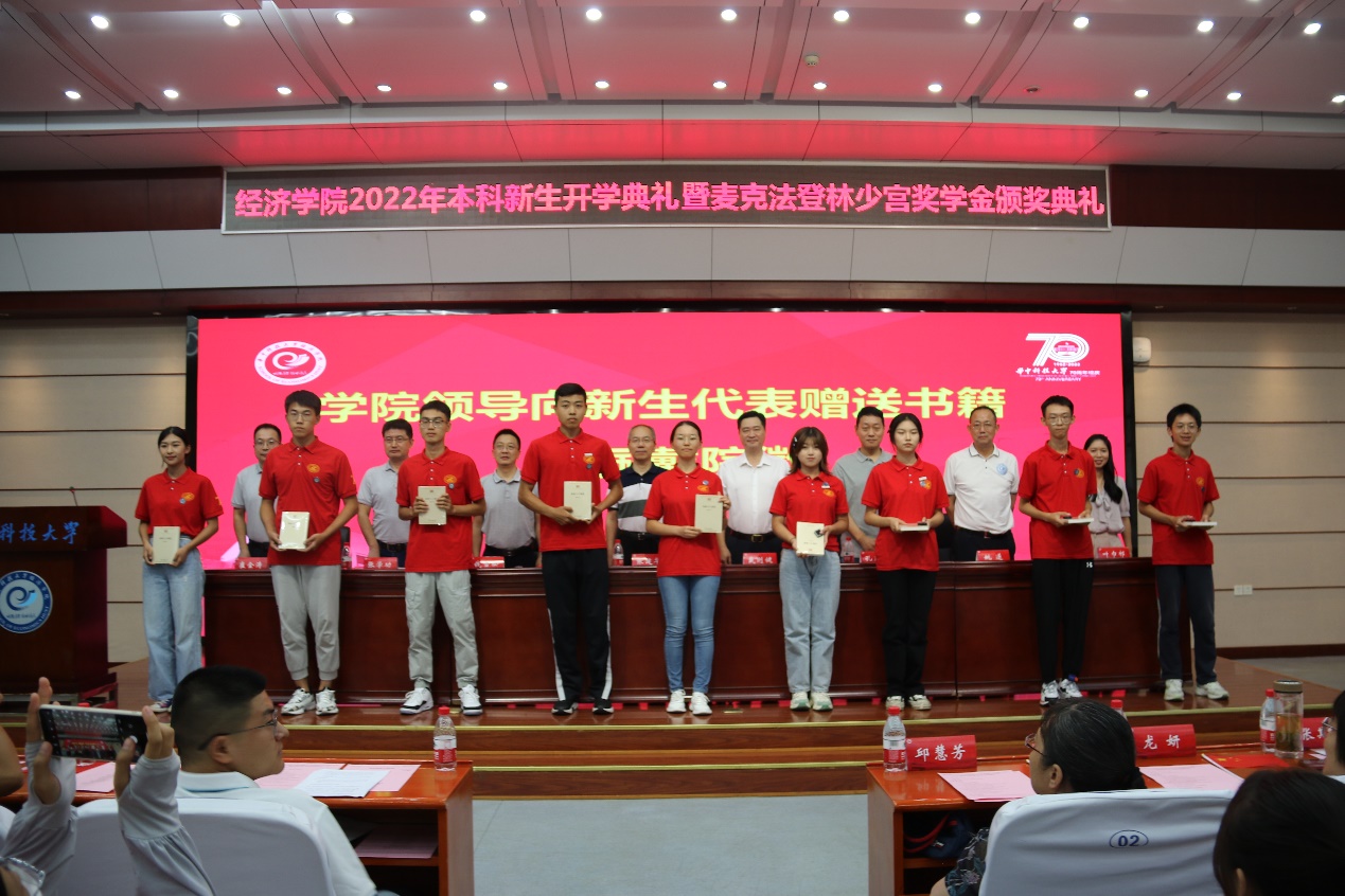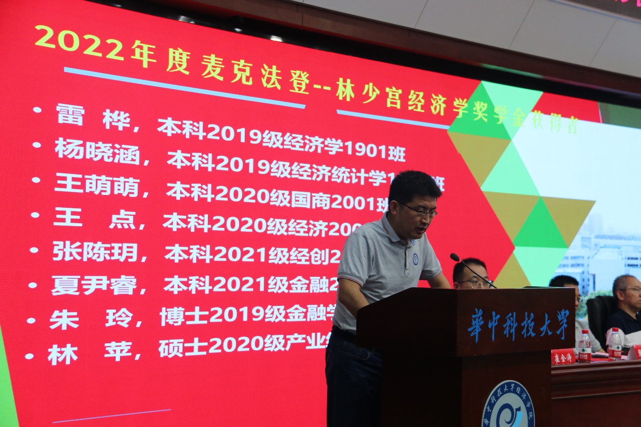 赠书之后还举行了麦克法登—林少宫奖学金颁奖典礼,张学功老师向新生们详细介绍了麦克法登—林少宫奖学金的背景信息,并宣布本年度获奖名单:本科19级雷桦、杨晓涵,本科20级王萌萌、王点,本科21级张陈玥、夏尹睿,20级硕士林苹,19级博士朱玲。获奖代表王萌萌发言,她分享了经济学专业的学习乐趣和独特魅力,并回忆了与3044永利集团老师们在课堂内外相处的点点滴滴。她还以“全面综合发展,首获优秀自我”和“以实践报国为己任,实现自我价值”与全体新生共勉。