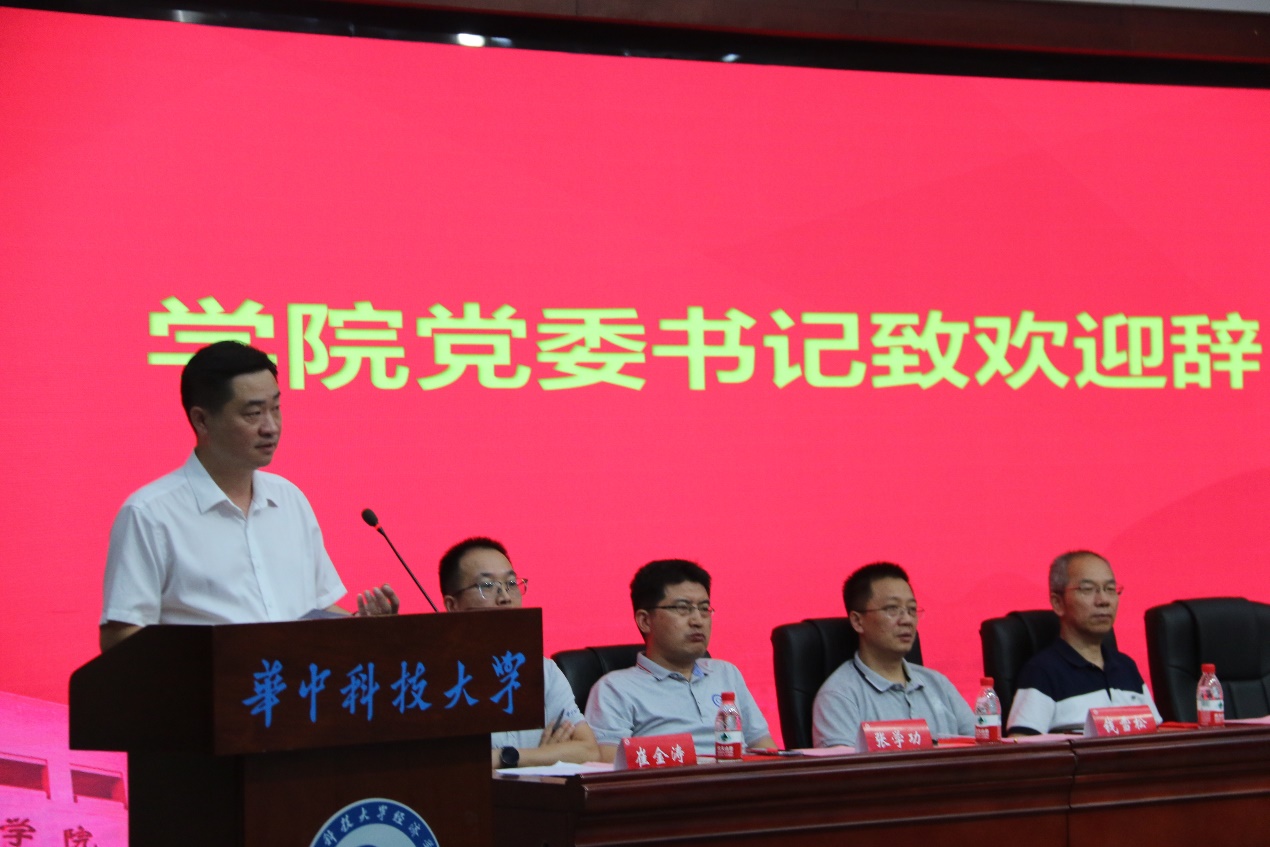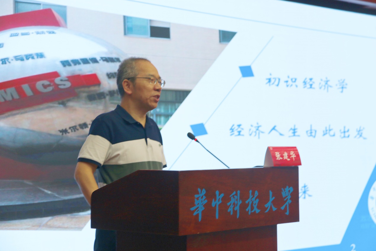 典礼结束后,经理张建华教授为全体新同学讲授开学第一课。张经理结合当今局势与时代趋向,深入浅出地向新生介绍了经济学科的发展历程和它在个人和社会发展中的重要性。最后,张经理期待全体新生能追求积极人生、欣赏和谐人生、注重自主人生、向往淡泊人生,开启经济人生,成就美好的未来。