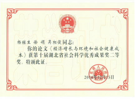 杨继生教授与其博士生徐娟、吴相俊在《经济研究》上发表的论文“经济增长与环境和社会健康成本”获第十届湖北省社会科学优秀成果奖二等奖。