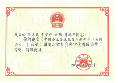 钱雪松教授与其研究团队撰写的系列论文“企业内部资本配置效率问题研究——基于融资歧视和内部人控制的一般均衡视角”(《会计研究》)、“股权关联影响了企业间信贷价格吗”(《金融研究》)、“委托贷款操作机理与金融风险防范”(《改革》)、“信贷热潮对银行脆弱性的影响”(《国际金融研究》)等论文获第十届湖北省社会科学优秀成果奖三等奖。