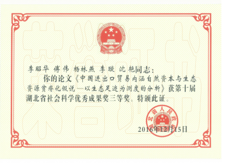 李昭华教授与其研究团队的获奖成果由2013年、2014年发表的四篇论文组成:《中国进出口贸易内涵自然资本的生态足迹分析》,李昭华,傅伟,《中国工业经济》,2013年第9期;《产权制度与发展中国家生态资源贫瘠化:以南北贸易为中介变量的影响机制分析》,李昭华,杨林燕,《国际贸易问题》,2014年第2期;《中欧双边货物贸易自然资本的生态足迹分析——基于产品用地系数矩阵(PLUM) 方法》,李昭华,李璇,《国际贸易问题》,2013年第3期;《中美双边货物贸易自然资本的生态足迹分析》,李昭华,傅伟,沈艳,《中国人口.资源与环境》,2013年第3期。