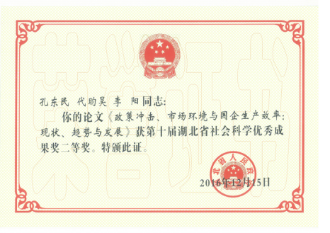 孔东民教授、代昀昊博士后与博士生李阳在《管理世界》上发表的论文“政策冲击、市场环境与国企生产效率:现状、趋势与发展”,获得第十届湖北省社会科学优秀成果奖二等奖。