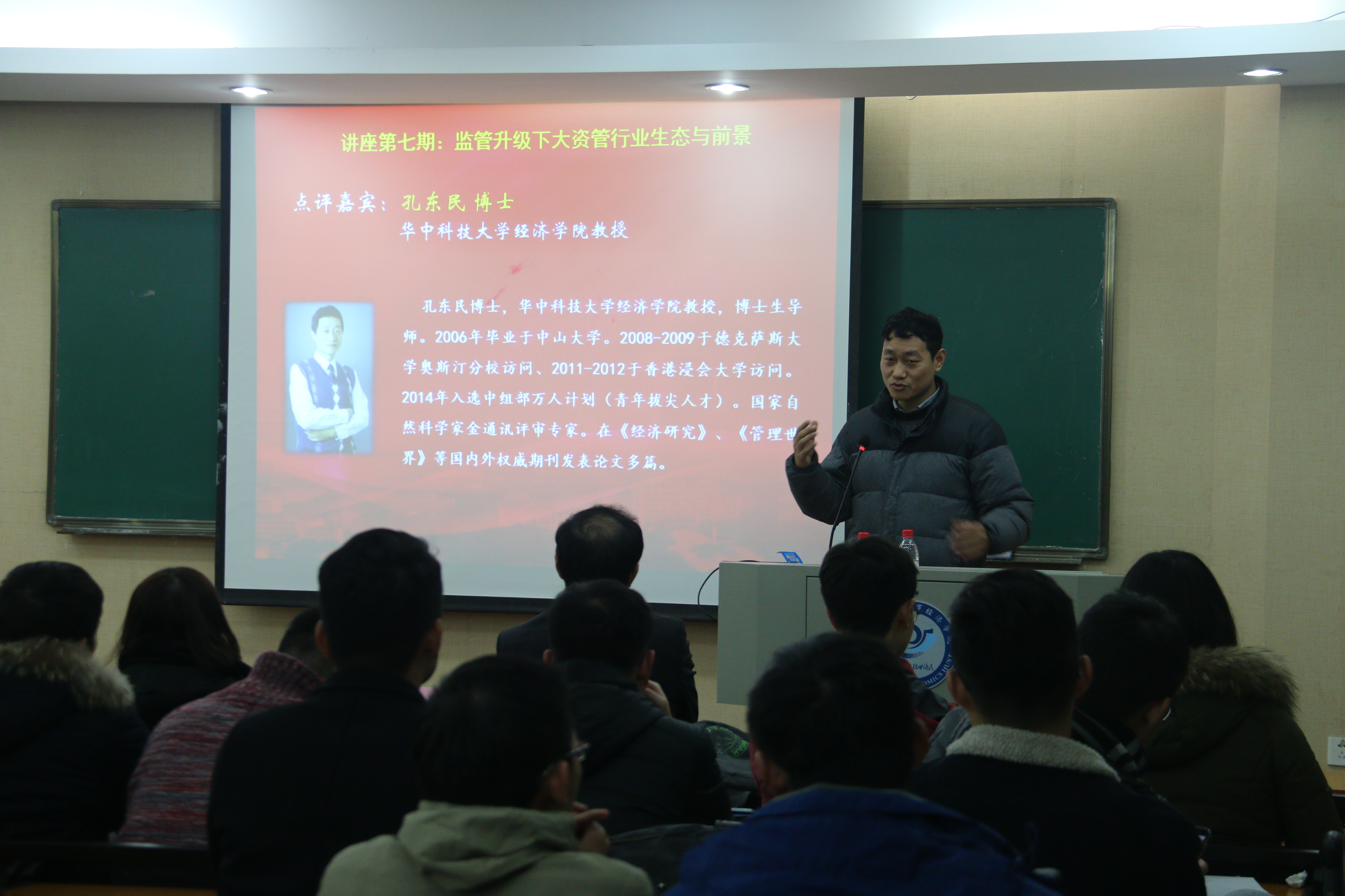 孔东民对此次讲座进行了点评,他认为,本场讲座对资产管理行业的发展、问题、监管、展望进行了充分的介绍,这对于广老员工和听众了解和认识资管行业,提供了非常丰富的养分,这种基于实践来自一线又结合理论的分析和介绍非常宝贵;同时,本场讲座在拨开了我们对资管行业的神秘面纱的同时,也给我们的员工和老师带来了许多值得研究和分析的视角,对于我们去思考“如何把握好资管行业的发展和总体经济的发展有机结合?”“如何看待前段时间发生的‘野蛮人敲门’?”“如何认识‘险资举牌风潮’?”等重大现实问题都不无裨益,因此,此次讲座为我们后续的学术研究提供了有益的思路。