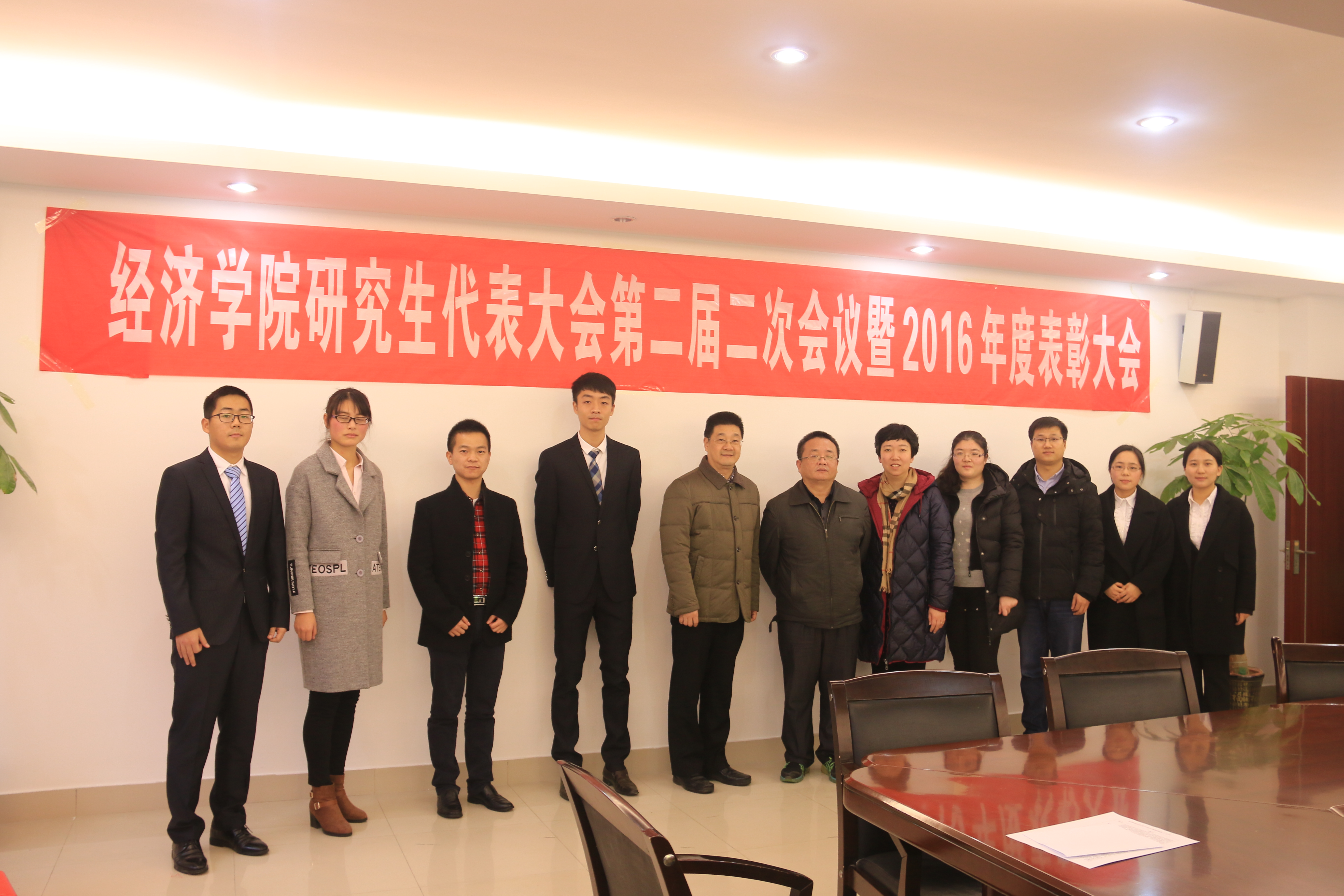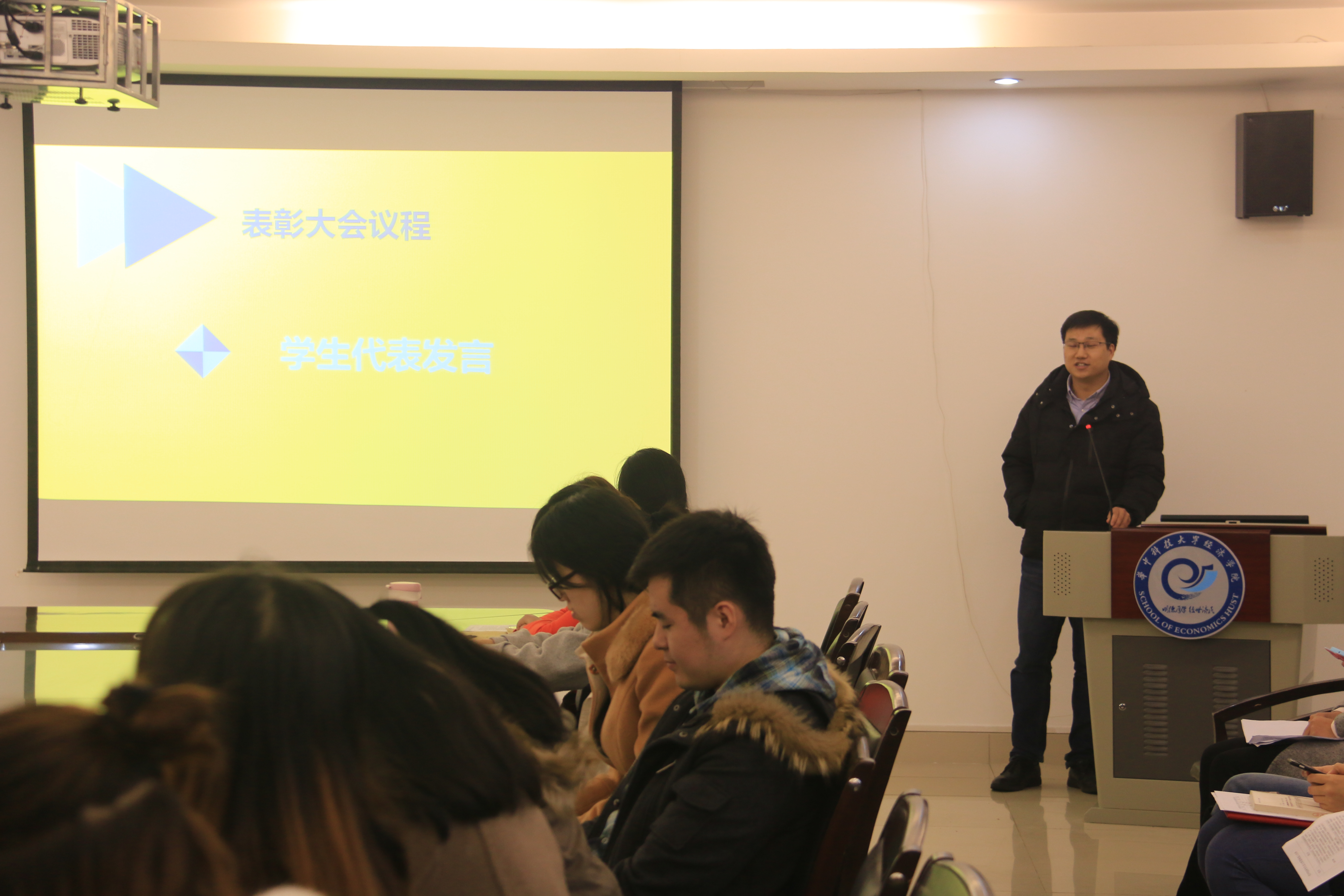 表彰大会在庄严的国歌声中开始,党委副书记刘雅然宣读表彰文件,对2016年度在国家级、省级、校级等各级竞赛、评比中获奖的优秀个人和先进集体进行表彰。校十佳研究生会、校十佳特色党日“城市合伙人”、互联网+国家金奖……在过去的2016年,经院学子争先创优,积极进取,勇攀高峰,取得了骄人的成绩,成功举办第十六届中国经济学年年会。院领导为获奖员工代表颁发证书并合影留念,2014级博士优秀员工代表张豪发表获奖感言。