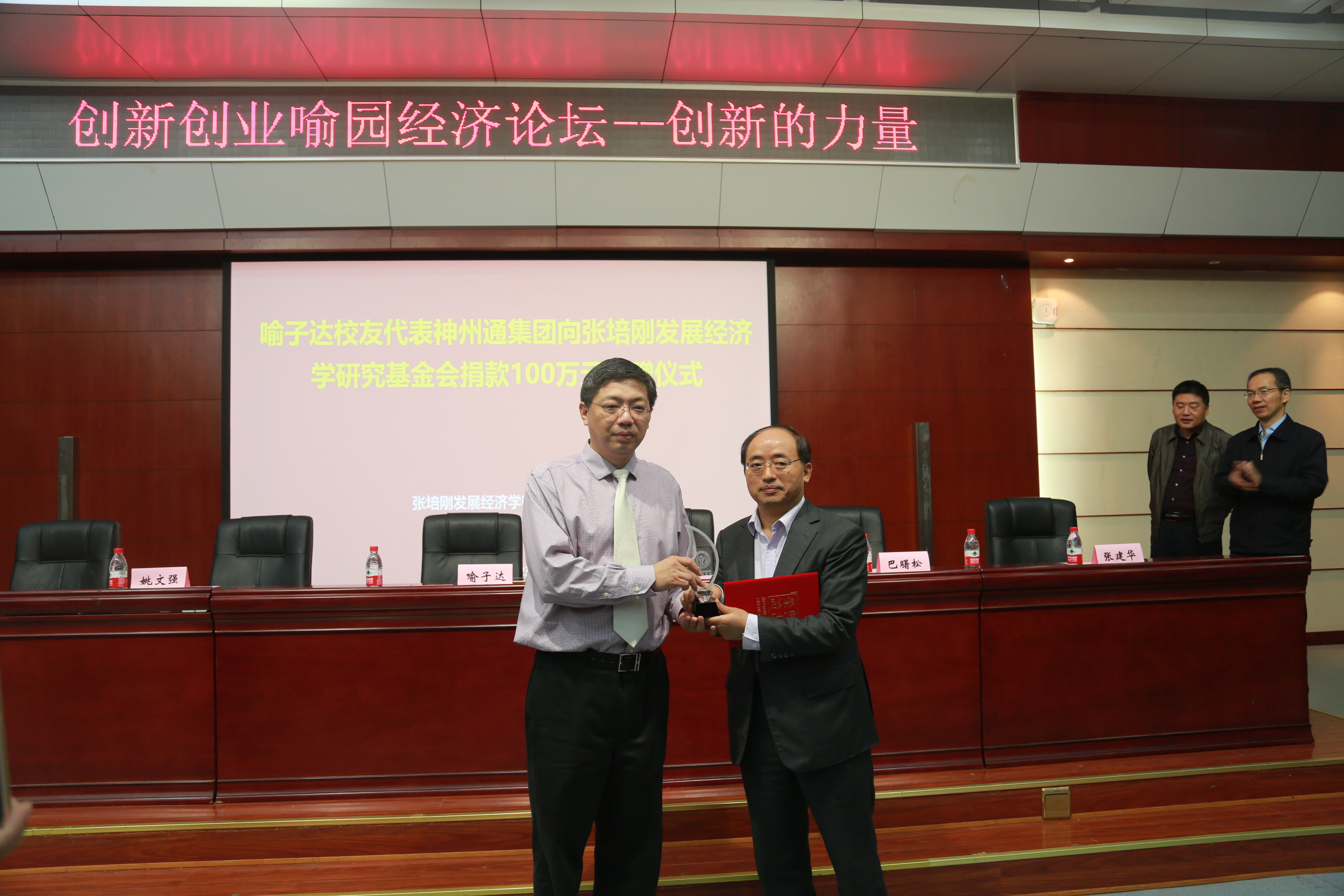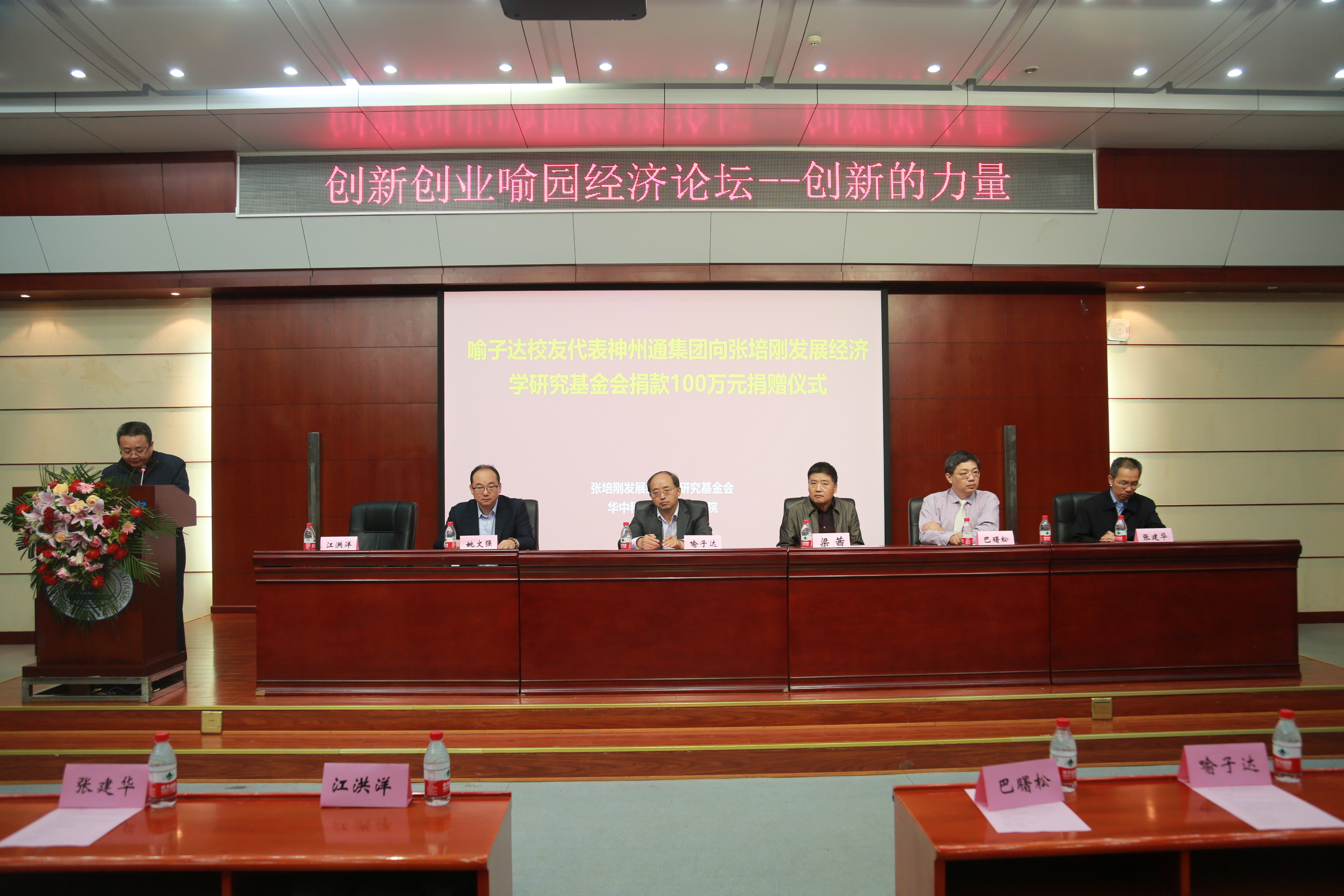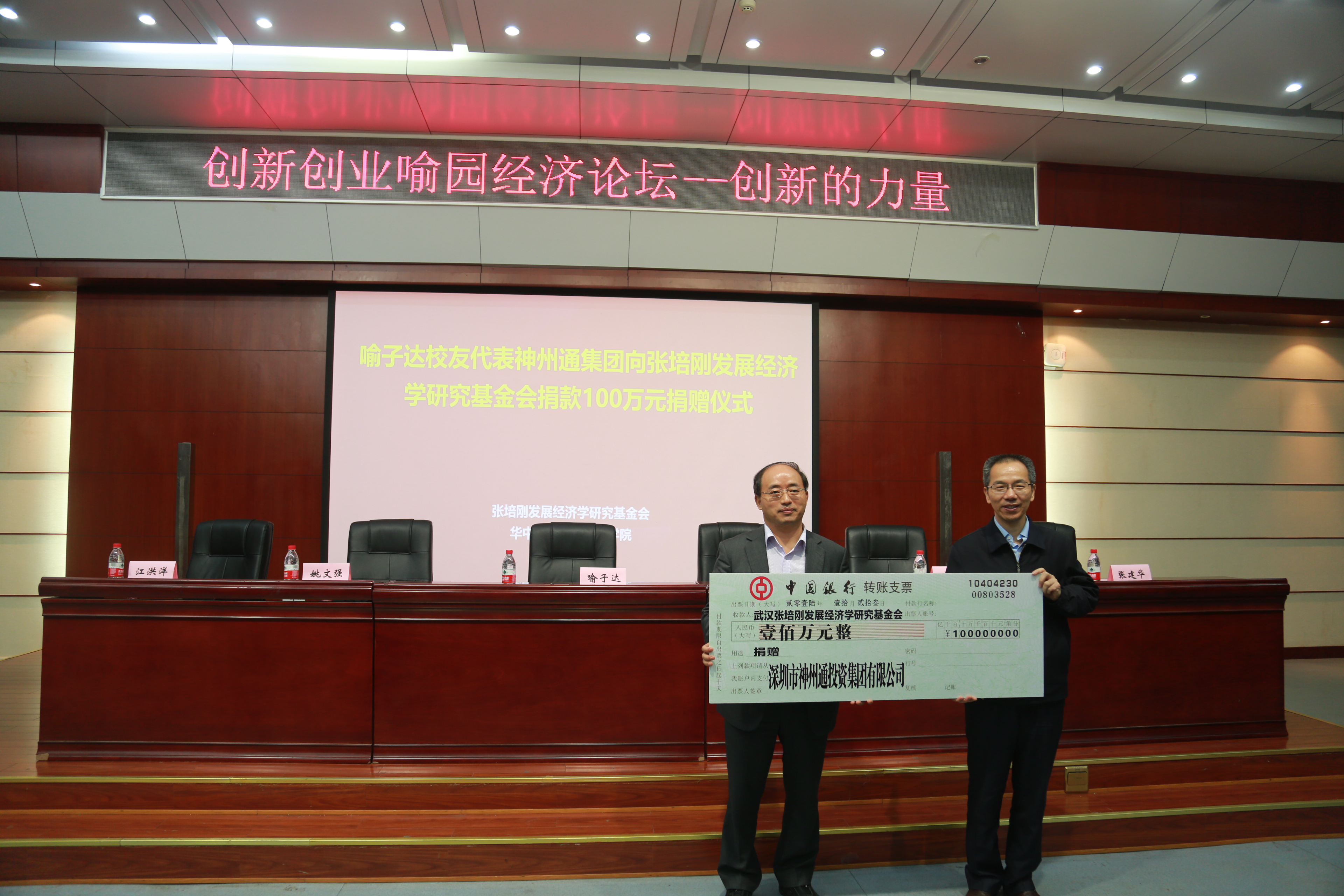 10月23日下午4时,员工喻子达代表深圳市神州通投资集团有限公司向张培刚发展经济学研究基金会捐赠100万元,捐赠仪式暨创新创业喻园经济论坛在3044永利集团报告厅举行。