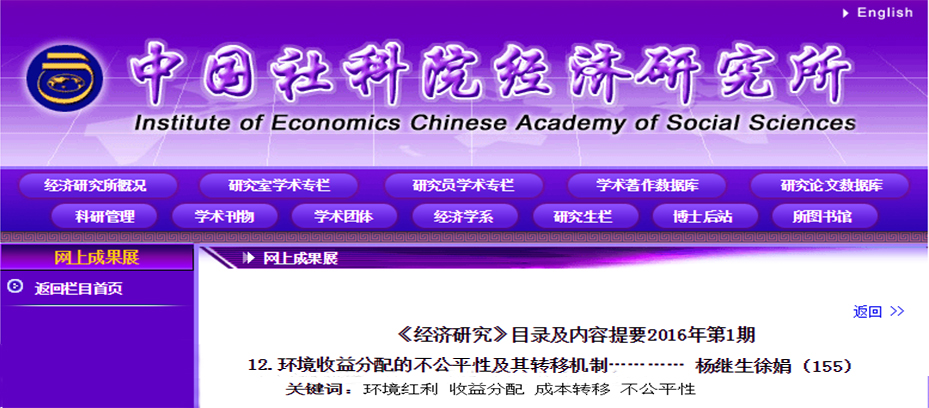 杨继生与徐娟合作,针对环境收益分配归属不清晰以及分配形式不明确的问题,提出了一种新的解决方案。与现有文献不同的是,该方案解决了环境红利不可观测的问题,测度了环境红利在不同经济主体之间的分配比例,揭示了环境红利分配的不公平性,而且衡量了地区间的环境成本转移比例。研究结论具有很强的政策意义。研究表明,为了解决环境问题,一方面可以增收环境税,而且是价外税,另一方面应该改变现在中央和地方财政分成比例一致的做法,给污染成本承受较高的地区更多的分配比例,为解决我国环境问题提供了一个全新的视角。