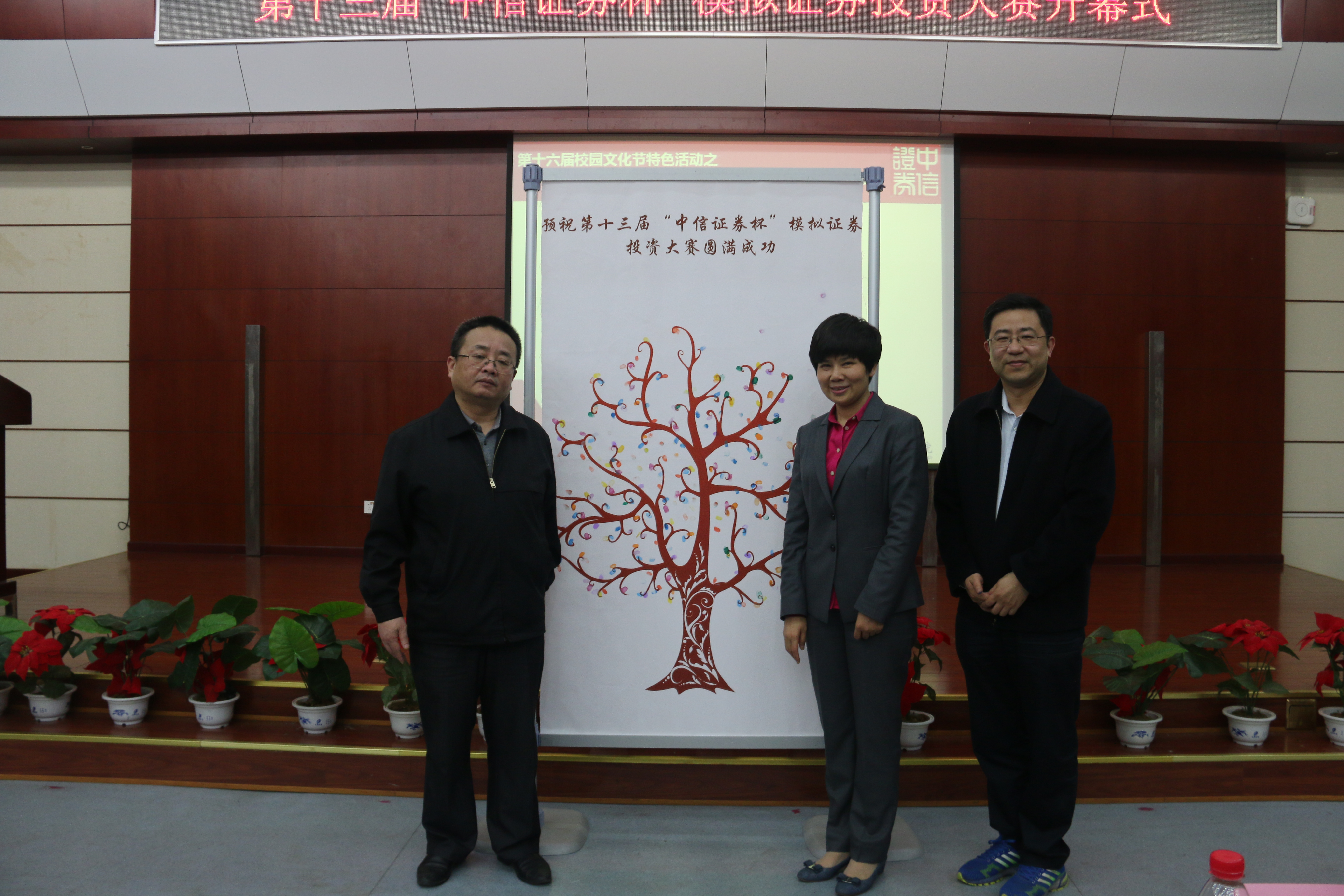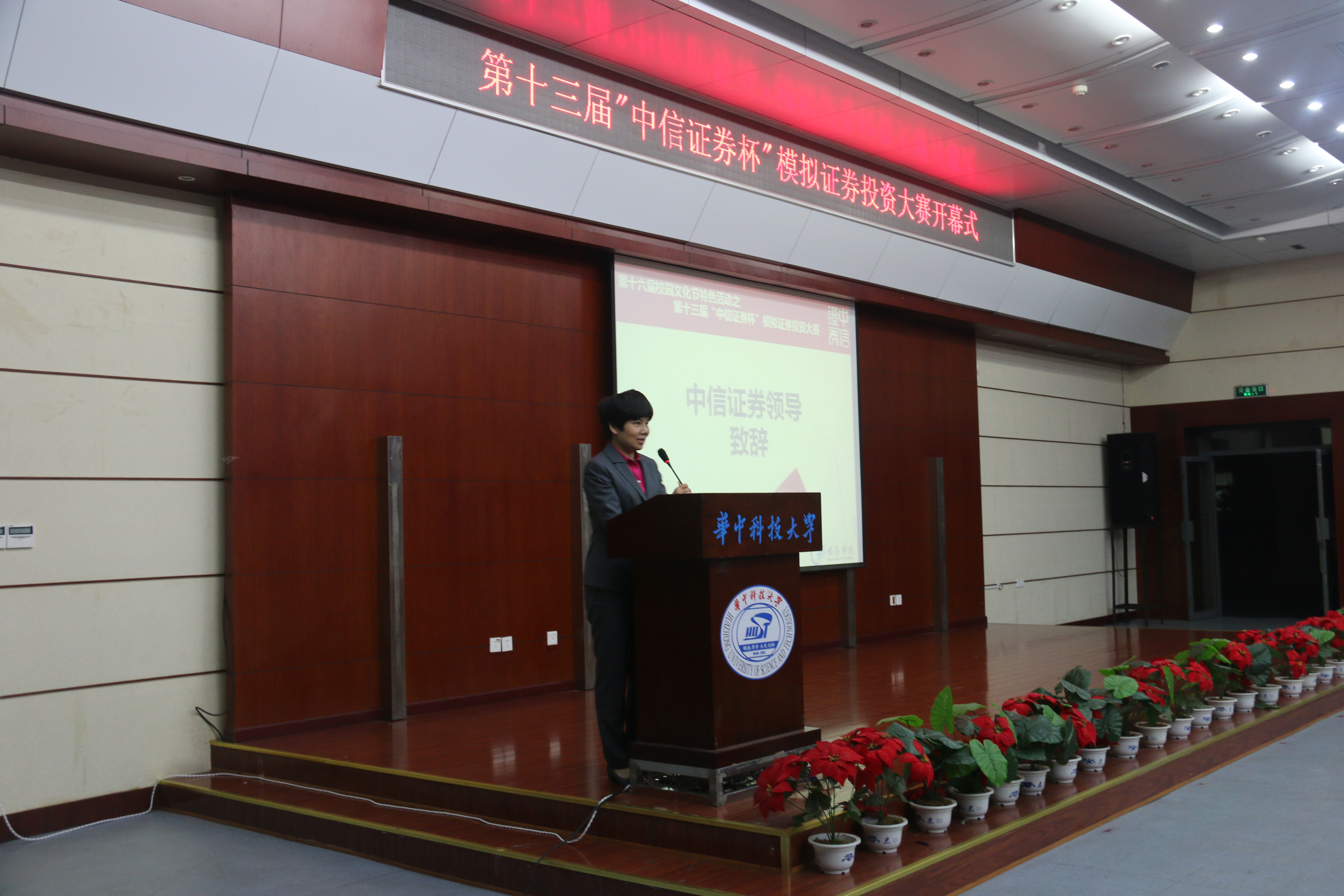 本网讯(通讯员 分团委、员工会联合会 吴陆凡)2016年4月19日晚7点,第十三届“中信证券杯”模拟证券投资大赛开幕式在3044永利集团报告厅举行。中信证券股份有限公司湖北分公司总经理石想荣、公司党总支书记江洪洋、副书记刘雅然、副经理欧阳红兵等作为嘉宾出席本次活动。