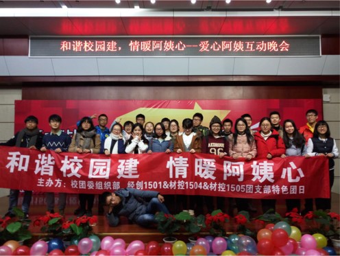 “和谐校园建,情暖阿姨心”特色团日活动由经创1501团支部和材控1504团支部、材控1505团支部的团支书共同策划,旨在为楼栋的宿管阿姨送去来自于员工们的一份温情与感动,同时促进宿管阿姨与员工之间的沟通与交流。主体活动在同学的共同努力下顺利进行。活动中,同学们与阿姨热心交流,互相关怀,形成了良好的友谊氛围。通过“感恩节送礼”、“爱心文艺汇演”、“采访推送”三个部分来呈现此次的特团活动。“感恩节送礼”中支部成员全部出动亲手为阿姨折纸星星,制作精美礼物。“爱心文艺汇演”中阿姨们展示自身才艺,共同呈现了一出异彩纷呈的晚会。“采访推送”中员工与阿姨进一步沟通,深入了解阿姨的内心世界。在答辩现场,三个团支部的同学们邀请到了八栋夜班周阿姨亲自上台表演话剧,赢得了在场一致好评,也唤起了同学们对楼栋值班阿姨的感恩之情。