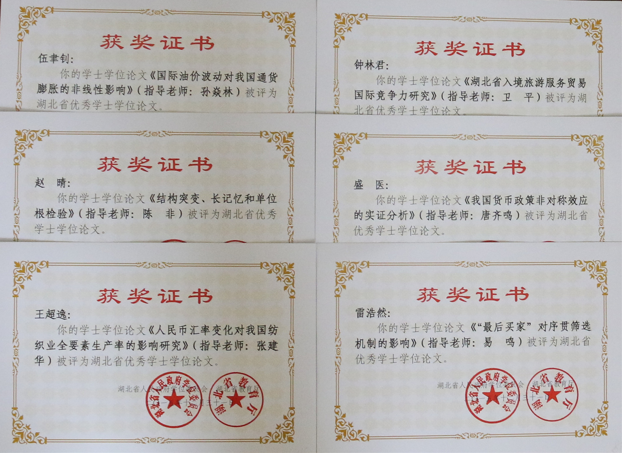 本网讯(记者团 曹曙) 湖北省人民政府学位委员会和湖北省教育厅《省人民政府学位委员会 省教育厅关于公布2015年全省优秀学位论文评选结果的通知》,公司张建华,唐齐鸣,孙焱林,卫平,陈非,易鸣六位老师指导的本科生论文获评湖北省优秀学士学位论文。他们分别为: