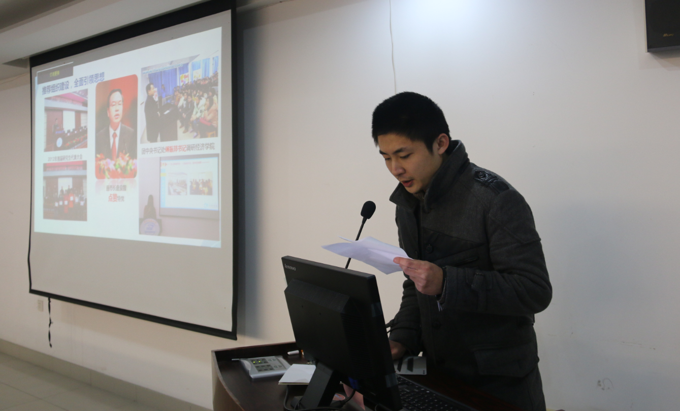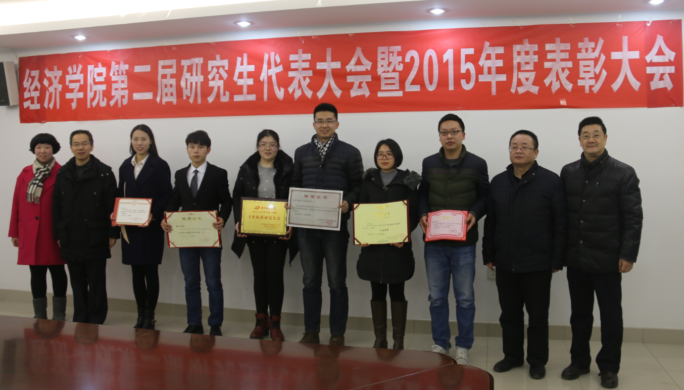 党总支副书记刘雅然宣读表彰文件,对2015年度在国家级、省级、校级等各级竞赛、评比中获奖的优秀个人和先进集体进行表彰。研究生国家奖学金、校“研究生品德模范”、“红色领航员”优秀营员……在过去的2015年,经院学子争先创优,积极进取,勇攀高峰,取得了骄人的成绩。院领导为获奖员工代表颁发证书并合影留念,优秀员工代表聂飞发表获奖感言。