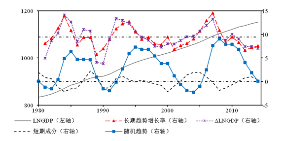 该文的创新性研究和结论可以概述为,构建GDP、消费、投资和净出口等宏观经济变量的宏观协整(cointegration)系统,将协整系统的简约误差修正模型(vector error correction model, VECM)模型转换成结构VECM(SVECM)模型,并进一步转换为包含协整信息的结构滑动平均模型(SMA)。基于此,该文通过SVECM和SMA而识别长期和短期冲击,并估计长期和短期冲击效应。所谓长期冲击是对经济增长产生持久影响的冲击,代表技术进步、制度变革等长期经济增长因素对经济增长的冲击效应。而短期冲击对经济增长只具有短期影响,代表名义货币、预期变化等短期经济波动因素。该文通过对SVECM的转换而实现了将我国的GDP数据首次分解为长期趋势和短期成分。其分解结果为下图。