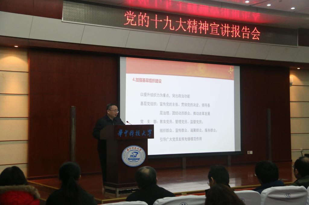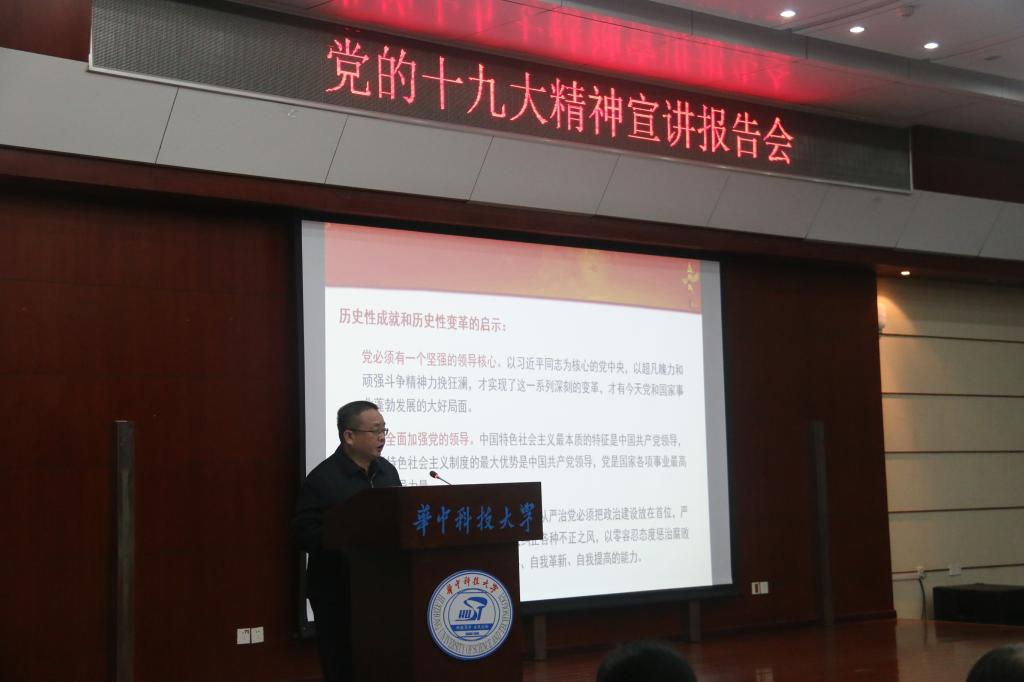 江洪洋从党的十九大召开盛况、深刻理解党的十九大精神、认真贯彻党的十九大精神三方面展开宣讲。在介绍了十九大报告的起草、两委委员的推荐和党代表的产生过程及十九大的主要议程和成果后,江书记强调,党的十九大是在全面建成小康社会决胜阶段、中国特色社会主义进入新时代的关键时期召开的一次十分重要的大会,全院师生要充分认识党的十九大的重要意义。