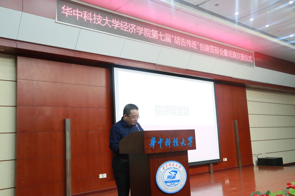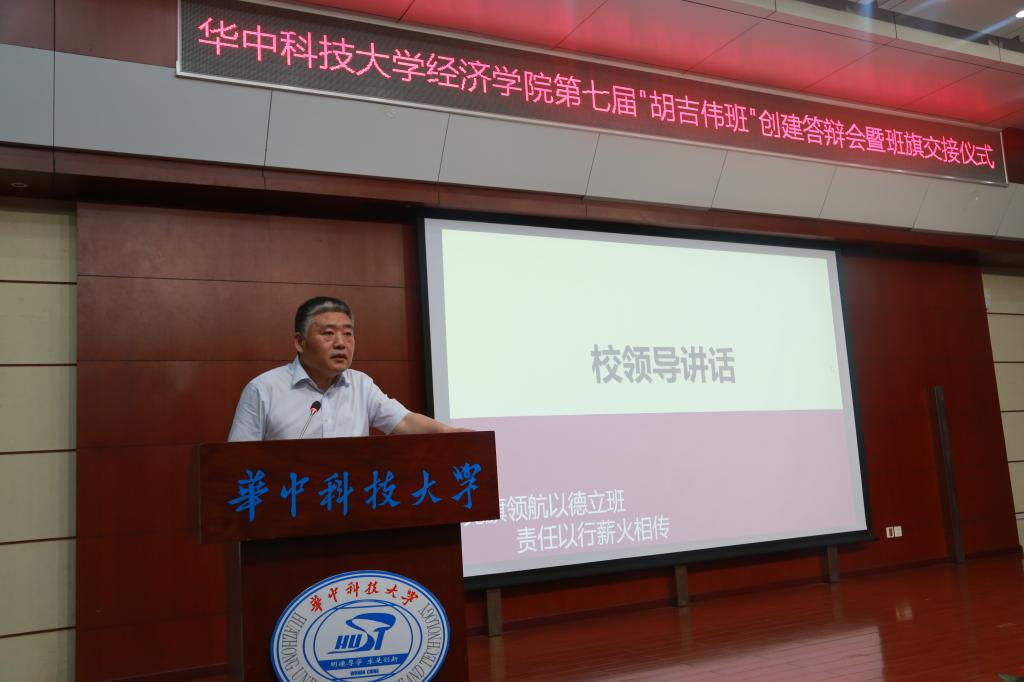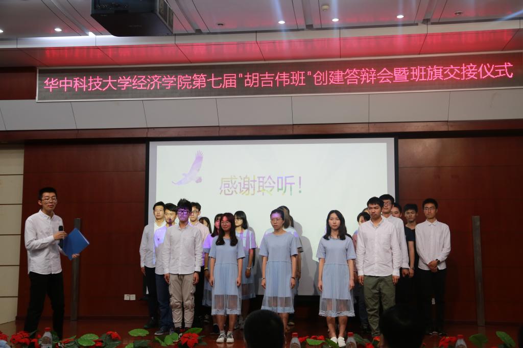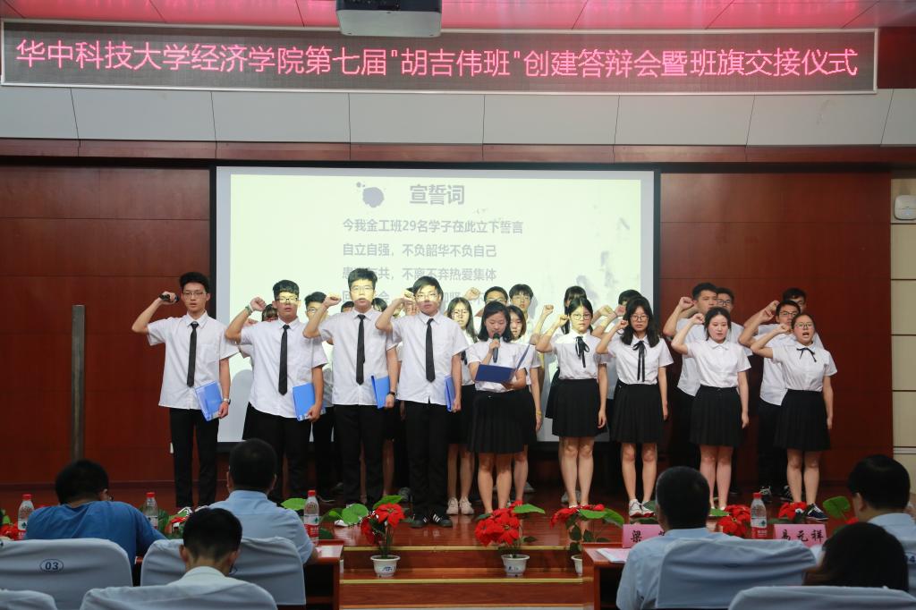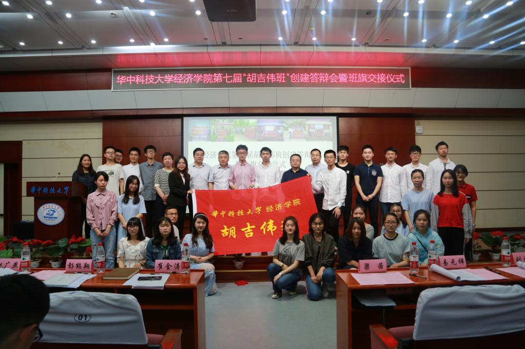 公司党委书记江洪洋将象征胡吉伟精神的旗帜传递给经济学创新实验1701班。