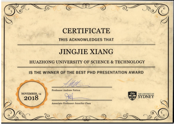 向镜洁同学精彩的报告受到专家们的一致好评,并从澳大利亚、美国、日本、中国等世界各地的参会代表中脱颖而出,获得会务组颁给博士研究生的最高荣誉:“最佳论文报告奖”(The Best PhD Presentation Award),也是全场唯一一个获此殊荣的员工。大会特邀嘉宾,杜克大学的Andrew Patton教授认为该论文推进了因子模型的理论研究,并将在金融计量分析和预测中起到重要的作用。会议主席,悉尼大学的Richard Gerlach教授则认为向镜洁同学纯正的美式口音、极强的语言表达能力,和临场应变能力对其留下了深刻的印象。最后,会务组一致同意将全场唯一的“最佳论文报告奖”颁给向镜洁同学。
