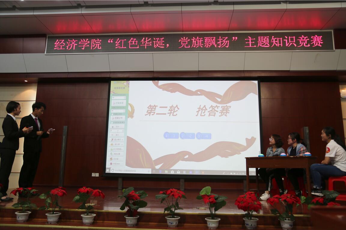 此次竞赛共有9支队伍参赛,第一轮比赛中,各党支部参赛选手都表现优异,回答快速准确,赢得在场观众阵阵喝彩。中间的计分时段,进行了红歌接歌词的小游戏,五位观众在台上接歌词,引发阵阵掌声。第一轮比赛结束,共有6支队伍进入第二轮。第二轮抢答赛中,由主持人分别给出三条线索,队伍派一个人参与抢答,共有三支队伍晋级至第三轮,分别是本科2016级经济党支部,本科2016级金融第一党支部和本科2017级党支部。在最后的决赛中,选手们一上场就营造了紧张的氛围,三支队伍互不相让,展现出了他们的实力。本科2017级党支部表现亮眼,使得他们成为最终的冠军队伍。另外两支三强队伍中,本科2016级经济党支部获得亚军,本科2016级金融第一党支部获得季军。