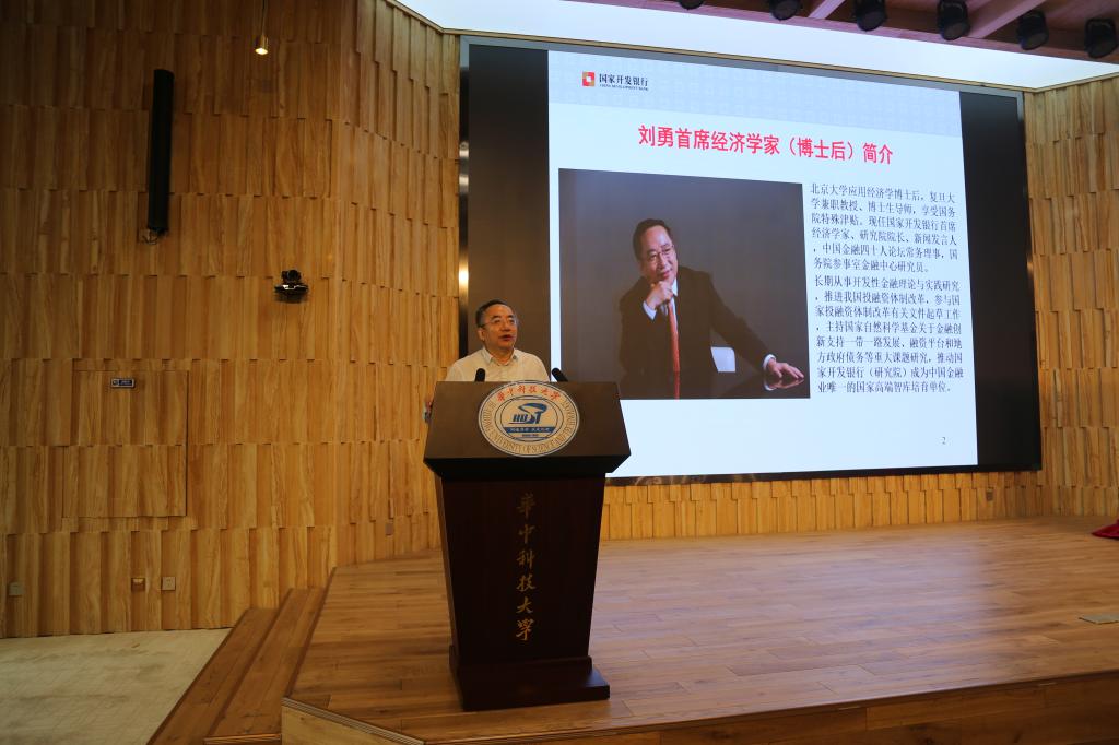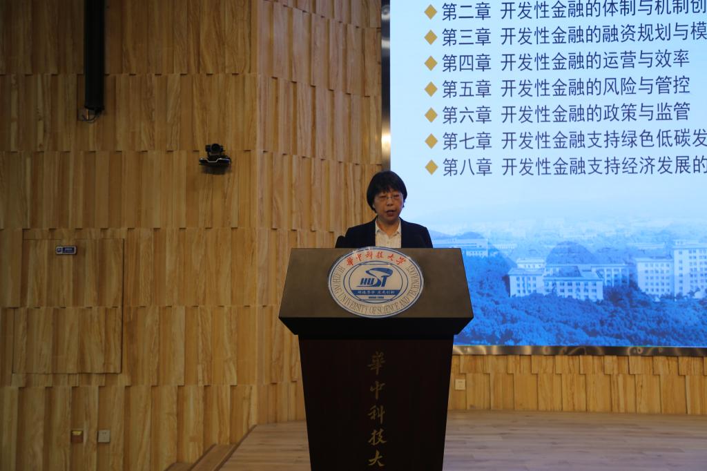 唐齐鸣教授代表课题组全面介绍了教材编写的目的、框架及特色。该书系统地总结了开发性金融的发展历程,探讨实现开发性金融的特色路径,即国家信用和市场服务的协调统一,行了完整的开发性金融理论与实践体系。《开放性金融理论与实践》教材发布仪式随后举行。国家开发银行首席经济学家刘勇教授还进行了大会主旨演讲,他表示开发性金融依托国家信用,服务国家重大战略,定位于重大项目与基础投资的批发银行,在供给侧改革和“一带一路”等国家战略方面发挥了重要的金融支撑和资金引领的作用。他同时希望通过与华中科大的合作,共同促进开发性金融的理论研究、团队建设以及人才培养。