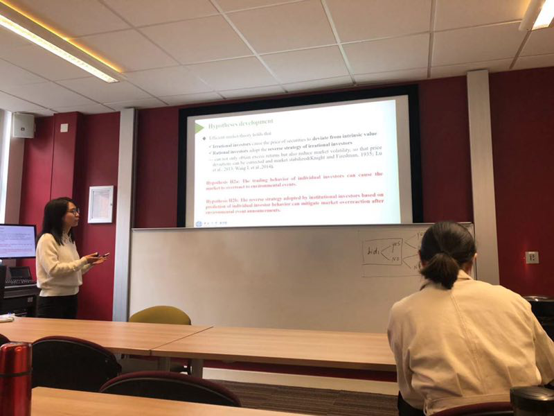 伯明翰大学数学公司博士生王怡昕报告了主题为“Willingness to Pay for Environmental Quality Improvement in China, using Dichotomous-choice Contingent Valuation Method”的文章。文章引入了一个完整的模型和分析系统来评估中国改善环境质量的意愿,详细描述了福利测度的二分选择条件估值法和效用函数。最后,伯明翰大学数学公司的博士生肖丹报告了“Institutional Investors’ Attention to Environmental Information, Trading Strategies and Market Impacts: Evidence from China”,该文章使用大型专有数据库盘中的高频交易,研究机构投资者的交易策略在处理负面环境事件披露上市公司对其市场的影响,从机构投资者角度揭示机制缺乏“绿色效益”的中国资本市场。