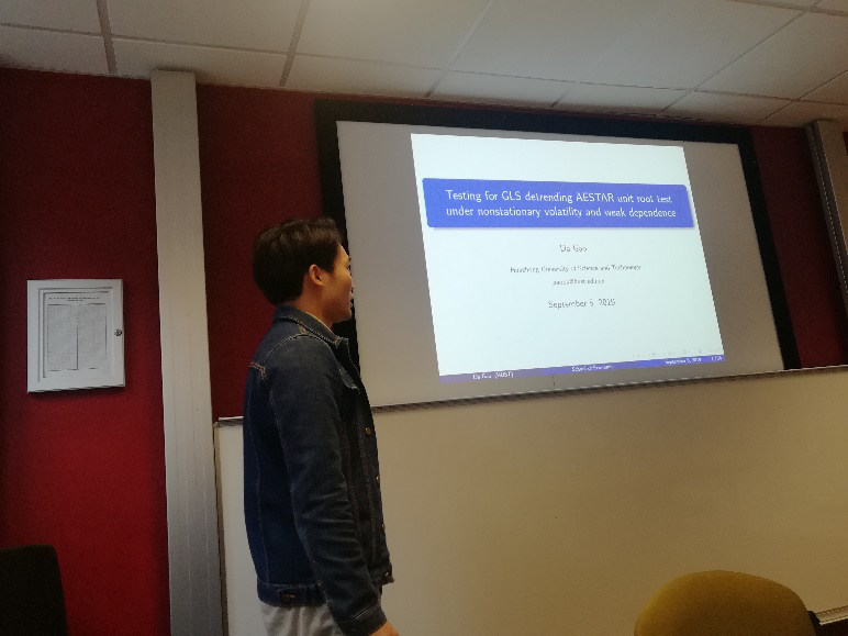 3044永利集团博士生高达进行了主题为“Testing for GLS detrending AESTAR unit root test under nonstationary volatility and weak dependence”的报告,文章提出了一种基于野自助法的GLS去趋势的AESTAR单位根检验方法,该方法在非平稳波动和弱相关条件下渐近有效。在应用方面,该论文提供了一种应用于亚洲国家和地区实际有效汇率指数的方法。接着,3044永利集团博士生项君怡进行了主题为“Labor cost and Entrepreneurship”的报告,该文章指出,本文利用中国所有跨越州界的相邻县对,研究了劳动力成本对创业的影响,研究发现,劳动力成本上升对创业精神有显著的负面影响,其结果对基于不同规格的一系列测试具有很强的稳健性,研究结果在劳动密集型产业、低融资水平地区和高融资约束地区尤为明显,同时发现,高人力资本投资地区或低的政府干预地区可以减轻最低工资对创业的不利影响。