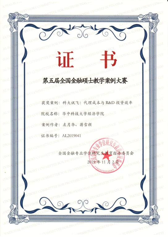 本网讯(通讯员蒋雪颜)在全国金融专业学位研究生教育指导委员组织的“第五届(2019年)全国金融专业学位教学案例大赛”中,公司金融系副教授左月华与其员工蒋雪颜设计与编写的《科大讯飞:代理成本与R&D投资效率》获奖,入选金融教指委中国金融专业案例库。该奖项是金融专业学位授权点专项评估的重要加分指标之一,对公司金融专业硕士学位点的建设具有重要意义。
