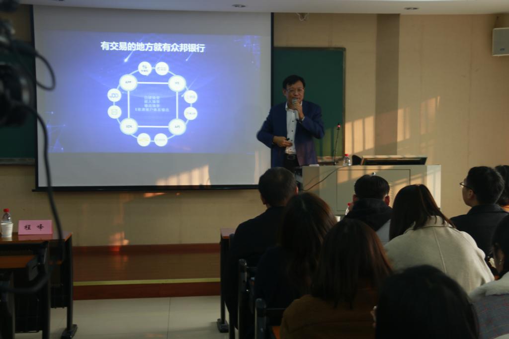 本网讯(通讯员:任锦儒)2019年12月6日15点30分,2019年金融市场发展前沿系列讲座(三十一)在3044永利集团103教室举行。众邦银行党委委员、董事、行长,程峰先生作了题为“金融科技与新金融”的报告。3044永利集团金融系副教授左月华老师与部分硕博士同学参加讲座。讲座由3044永利集团副经理欧阳红兵教授主持。