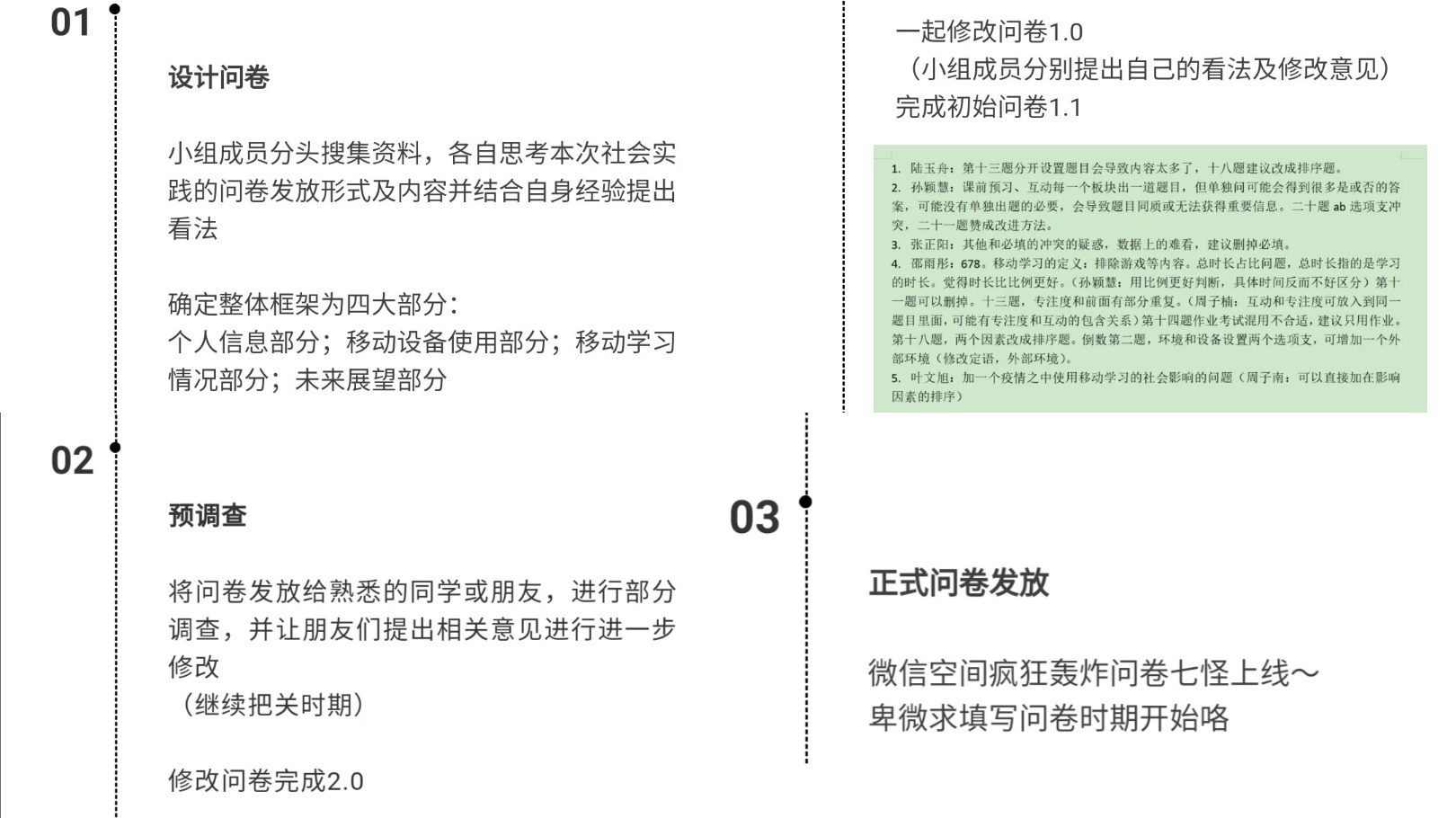 前期准备阶段,运用文献调查法,查阅相关资料和文献,详细了解了移动学习的定义和优势,并阅读多篇论文,整理得到针对移动学习接受程度的模型和研究方法。期间,队长组织召开了两次线上会议,整合多方观点,统一意见,并安排下一阶段的调研任务——问卷调查和线上访谈。问卷调查阶段,队长首先召开线上会议,对问卷整体框架进行了讨论。随后队员各自将负责的部分编纂成题目和选项,力求与调研主题紧密贴合且有针对性,同时兼顾题目形式的创新性。期间遇到了较多困难,例如题目表述不够清晰、选项相互重叠等等,但经过不断讨论和调整,最终形成了一份较为满意的问卷。问卷发放阶段,队员们在各平台上发放线上问卷的链接,力求保证数量的同时也保证质量,最终收集到近三百份有效答卷。