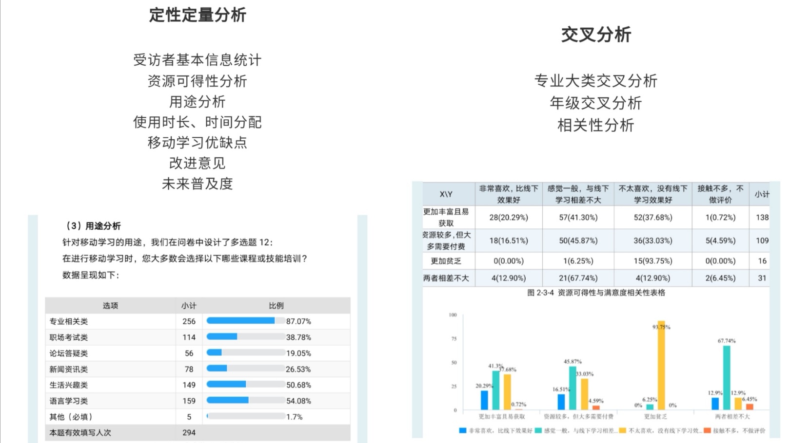 线上访谈阶段,队员们首先拟好采访大纲,并在线上会议中讨论修改。随后积极联系相关老师,运用腾讯会议等平台进行线上访谈。访谈交流十分融洽,老师对于采访问题做出了耐心和细致的回答,表达了对移动学习方式的观点和期望,同时队员详细记录整理了老师的回答内容。在同学访谈中,为使采访更具代表性,队员们尽量联系到各年级不同专业的同学进行采访,同时有针对性地调整采访问题,最后整理录音稿并提取出重点内容,为之后调研报告的撰写做好准备。访谈结果表明,由于无法高效实时互动和使用初期可能存在的技术问题,老师更加倾向于线下教学;对员工而言,移动学习一定程度上降低学习效率,且部分资源收费较高,这些都是移动学习的弊端所在。问卷结果分析阶段,首先共同讨论出整体思路,决定分成定性定量分析和交叉分析两个部分,之后各自撰写所负责的分析任务。在撰写分析报告时,各队员图文并茂,用书面语言对结果进行冷静客观的分析,推测现象背后的原因,并给予相应的建议。问卷分析结果表明,问卷填写者大多希望能够通过移动设备高效利用零碎时间自主学习,且不仅学习课内知识,课外技能也有所涉猎;在移动学习接受程度的影响因素中,自我管理能力与预期绩效期望对移动学习的评估结果影响较大。最后所有队员共同努力,形成了最终的调研报告书,圆满完成社会实践任务。