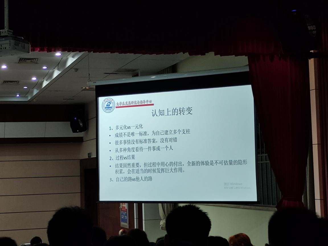 彭鹤翔在讲座中提到从高中到大学,需要同学们实现认知上的转变。就大学而言,生活不再像高中一样是一元化的,成绩虽然重要,但不是唯一重要的东西,而是要促进自身全方面发展。而除了成绩以外,在大学还有许多认知需要转变,比如很多事情并没有标准的对或错,从多角度看事情往往可以化解矛盾;过程和结果的重要性需要平衡等。