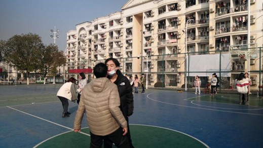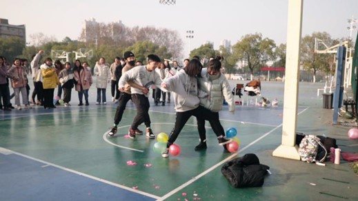 第三项踩气球活动中,每轮游戏需要两组,每组派出一男一女两位队员,女队员在一侧脚踝上绑4个气球,男队员不绑。开始游戏后两队成员需要保护己方气球的同时,在规定时间内尽可能多地踩破对方气球。时间截止或有一方气球全破则一轮结束。游戏过程中许多组别决定派男队员专门克制对方而让女队员互踩,形成了“我抱住对方,你尽管踩!”的局面。场面一度欢乐无比,虽然是冬日早晨,却可以玩出一身汗。