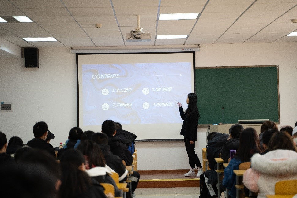 各部门部长候选人依次上台进行答辩。宣传部候选人王安鹏以“仰望星空,日益精进”为题回顾了自己的工作经历,表明要“找到心中热爱”,以求“轻装前行,不负年华”;勤工助学部候选人张泷尹指出了工作中可能遇到的“考核、宣传、参与”等问题,并提出可行方法,希望在未来能与部员们一起探讨实践。义工部部长候选人之一蒋翠梅表示“要做真正想做的事,坚定自己的选择,一旦承担便是责任”。另一位候选人郑云荟则针对义工活动供给小于需求的现状,提出美化校园、文明食堂等四个方面的义工活动开展方向。阳光俱乐部候选人岳睿思表明自己要做温暖有趣的人,“播撒阳光,收获暖意”。来自心援队的罗佩瑶表示:“自从加入心援队的那一刻起,心援队带给我的归属感之强烈使我一直认真负责、满怀热情地对待每一份任务,保证超常完成”,她希望能与部员们一同“用心援助,用爱陪伴”。