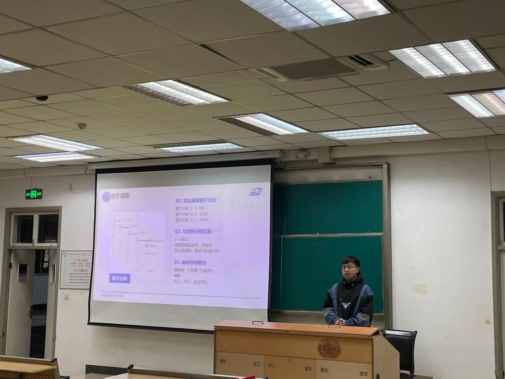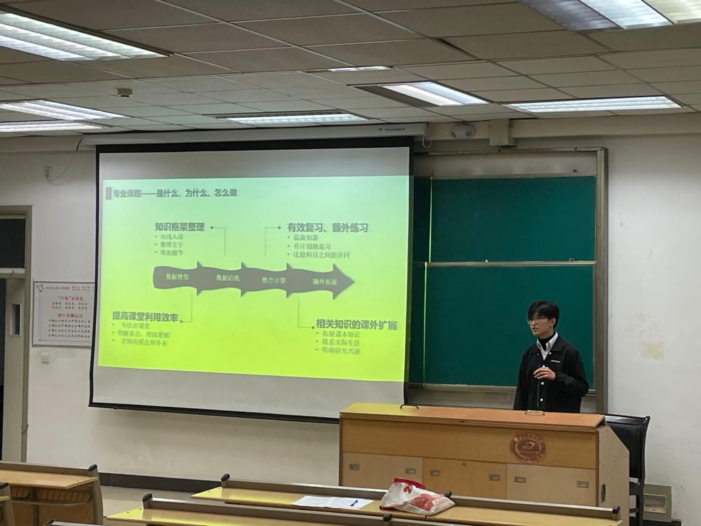 来自经统1801班的涂承铭同学从课程、保研、竞赛、老员工活四个方面进行了经验分享。关于课程方面,涂承铭同学强调,上课一定要认真听讲,注重思维逻辑和对知识的理解,自己整理知识框架,平常多关注时政新闻,在日积月累中夯实基础,以认真的态度对待思政课。接着,涂承铭同学向大家介绍了保研的相关信息,他表示,对于想保研的同学来说,奖励分可以锦上添花,但是学业分才是重头戏。对于竞赛,涂承铭同学联系自身的参赛经历,建议有兴趣的同学可以参与,不过有些竞赛需要投入的精力很多,要注意平衡时间,不要顾此失彼。随后,涂承铭同学还给大家分享了他的老员工活,既有学业上的孜孜以求,也有课余生活的丰富多彩。最后,涂承铭同学寄语同学们:“老员工活之所以被人们称为最美好的时光,就在于它因人而异,在于它有无限可能。你可以试着夯实基础,韬光养晦,在学术的道路上孜孜以求,你可以仁者乐山,智者乐水,在培养兴趣爱好的同时结交志同道合的伙伴,你也可以大胆追求桃花流水,去寻觅爱情的滋味,当然,你更可以追寻先辈足迹,坚定为人民服务的信仰,让个人的价值在集体中得以体现。”